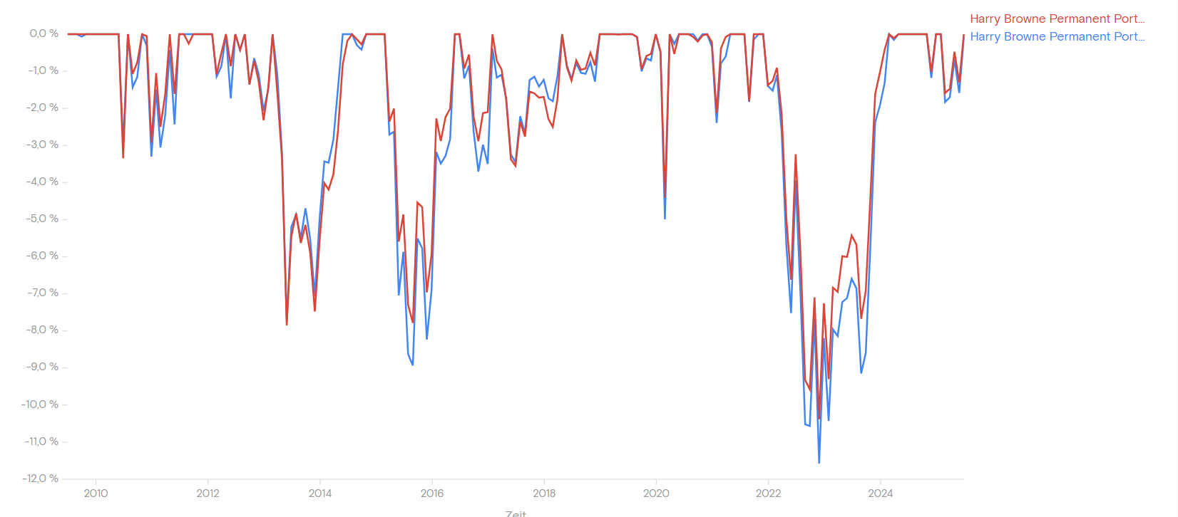 voxk 25. Februar In einem Blog habe ich die folgenden Daten gefunden: Permanent Portfolio EUR (2024): Aktien (MSCI EMU): +9,49 % Anleihen (Ger Gov 30y): -5,04 % Gold (Bullion): +34,46 % Cash (Ger Gov 1y): +2,97 % Total: +10,47 % Permanent Portfolio EUR mit ETFs: Aktien (LU2089238112): +9,7 % Anleihen (DE000A0D8Q31): -3,1 % Gold (DE000A0S9GB0): +34,6 % Cash (LU2641054551): +3,6 % Total: +11,2 % Quelle (Spanisch). Dazu auch eine Tabelle. Permanent Portfolio Blog.ods Diesen Beitrag teilen Link zum Beitrag