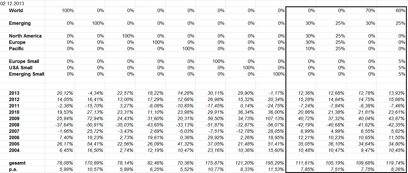 otto03 Dezember 3, 2013 Zumindest in den letzten knapp zehn Jahren wäre alle hier dargestellten jährlich rebalancierten Gewichtungen der nackten Kapitalgewichtung vor Kosten/Steuern überlegen gewesen. Quelle der Basisdaten: MSCI.com - alle Indizes in der € net Variante Hallo otto03, tolle Übersicht, kann man das Excelfile bekommen, würde mir das abtippen ersparen - Vielen Dank Habe dir eine PN geschickt mit dem File Diesen Beitrag teilen Link zum Beitrag
