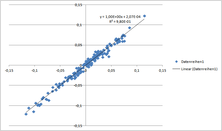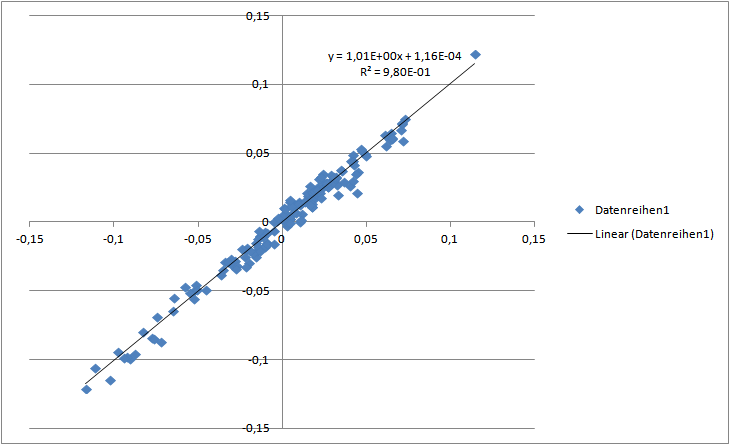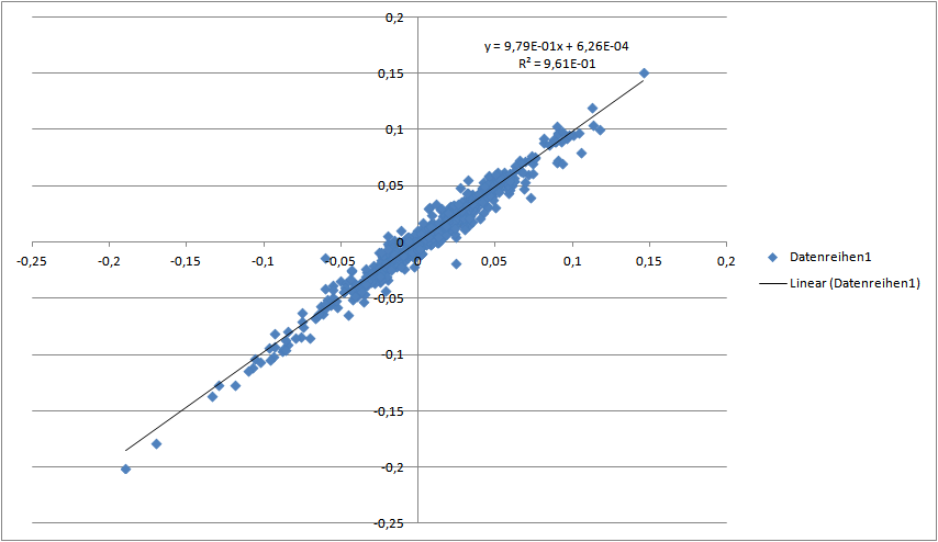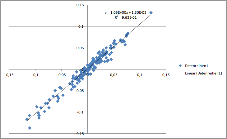 Chemstudent Dezember 3, 2013 Anbei ein paar Regressionsanalysen, basierend auf den MSCI Monatsschlusskursen: Alpha von MSCI World MCap vs. MSCI World GDP: In USD ab 1970: 0,75% p.a. In EUR ab 1999: 0,24% p.a. In EUR ab 2001: 0,14% p.a. Heißt also: besonders hoch ist das nicht gerade. Für den MSCI ACWI GDP vs. MSCI ACWI ist das Alpha seit 2001 aber durchaus höher: 1,57% p.a. Bitte beachtet, dass ich keineswegs Experte bei den regressionsanalysen bin. Schinzilord (und womöglich auch andere hier) haben hier mehr know how, über eine Überprüfung würde ich mich daher freuen. (Die Daten kann man sich ganz leicht bei MSCI besorgen: http://www.msci.com/products/indices/country_and_regional/dm/performance.html) MSCI World MCap vs. MSCI World GDP (ab 1970, in USD, NDTR) MSCI World MCap vs. MSCI World GDP (ab 1999, in EUR, NDTR) MSCI World MCap vs. MSCI World GDP (ab 2001, in EUR, NDTR) MSCI ACWI MCap vs. MSCI ACWI GDP (ab 2001, in EUR, NDTR) Diesen Beitrag teilen Link zum Beitrag