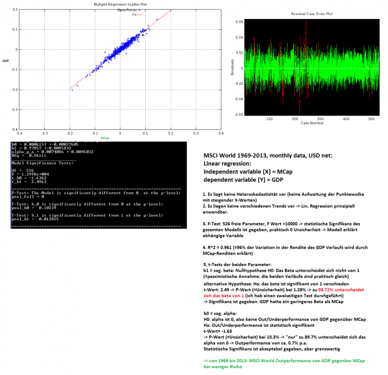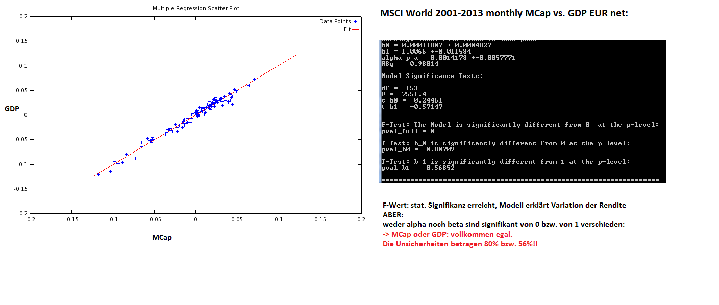 Schinzilord Dezember 4, 2013 Ich habs mal nachgerechnet: für die Regressionsparameter komme ich exakt auf die gleichen Werte wie du. Ich hab noch die ganzen statistischen Tests hinzugefügt und direkt in die Auswertungen kommentiert: Und zu guter Letzt: MSCI World ACWI GDP schlägt stat. signifikant MCap seit 2001 in EUR net: Das reicht mir als Begründung, ein abgespecktes BIP Weltportfolio nach MCap Regionengewichte zu machen. Diesen Beitrag teilen Link zum Beitrag