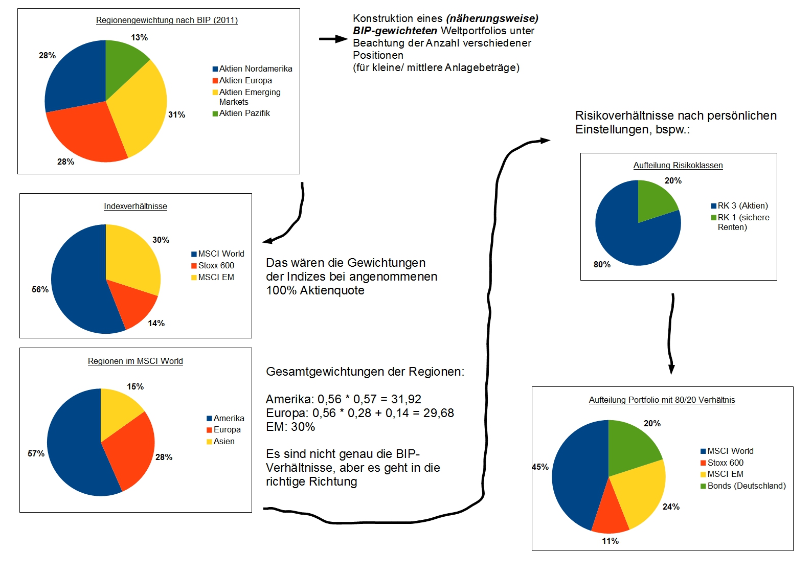 bortpholio März 30, 2013 Die Regionengewichtungen sind also: Amerika: 0,56 * 0,57 (Anteil Amerika am MSCI World) = 31,92% Europa: 0,56 * 0,28 (Anteil Europa am MSCI World) + 0,14 (Stoxx) = 29,68% EM: 30% Das kommt ja ungefähr in die Richtung der BIP Gewichtung. Mir war nicht bekannt, daß UK/GB eine derart hohes GDP/BIP haben Da stoßen wir an die Grenzen von marktkap. Indizes. Das Problem hat man auch bei einem Weltportfolio-Aufbau mit den einzelnen Regionen-Indizes. Im MSCI Europe hat GB auch eine Gewichtung von um die 30%, zum Vgl. Deutschland ca. 15%. Aber Recht hast du damit ... besonders gut gelöst finde ich das auch nicht^^ Diesen Beitrag teilen Link zum Beitrag