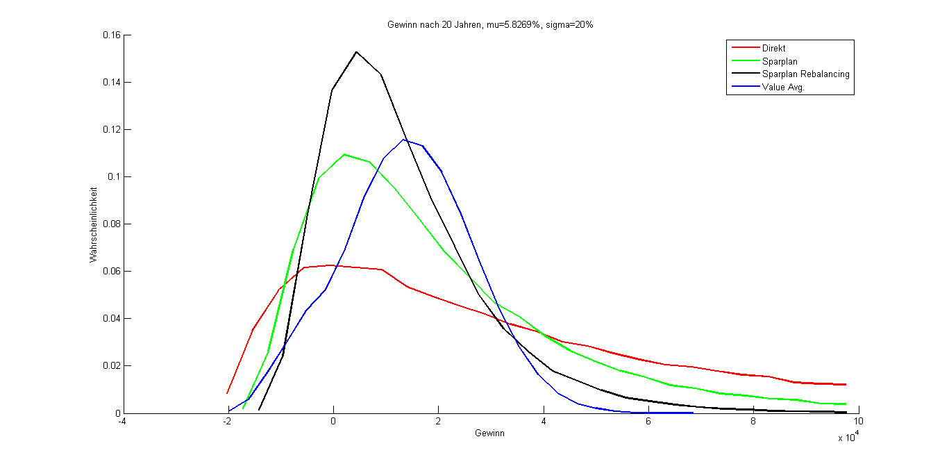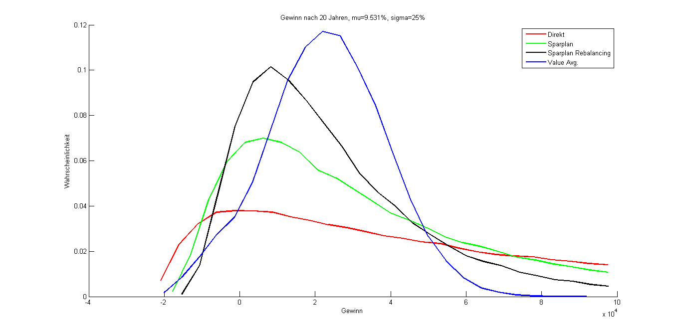 Yoko April 27, 2013 · bearbeitet April 28, 2013 von Yoko Ich habe die Idee von postguru mal in Matlab implementiert und dabei 100 000 Aktienkurse mittels Brownscher Bewegung simuliert. Als erwartete Rendite habe ich 6% bzw. 8% angenommen, als Volatilität 20% bzw. 25%. Dies entspricht in etwa den Werten von Aktienindizes wie dem S&P 500 (hat da jemand gute Quellen für bekannte Indizes über verschiedene Jahresreihen?). Das beschriebene Value Averaging Prinzip senkt zwar das Risiko von Kapitalverlust von ca. 19% auf ca. 13%, allerdings wird auch die erwartete Rendite von 6% p.a. auf 2,3% bzw. von 8% auf 2,97% reduziert, was meiner Meinung schon massiv ist. Im Anhang einmal Direktinvestment, Sparplan und Value Averaging im Vergleich für die simulierten Aktienkurse. Im AktienSim_Source.zip findet ihr den Matlab Code für alle die dies etwas weiter stricken wollen. Die Idee des Value Investing finde ich interessant, aber zumindest nach diesem Modell bringt es nur bescheidene Rendite. AktienSimulation_Source.zip Ergebnis.pdf Diesen Beitrag teilen Link zum Beitrag
