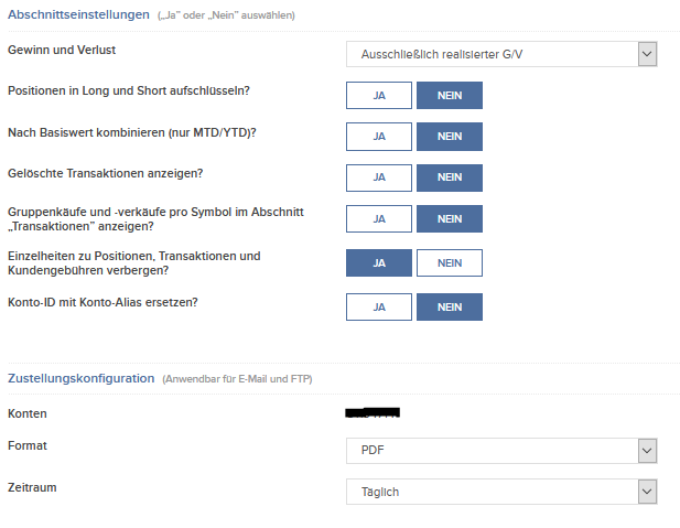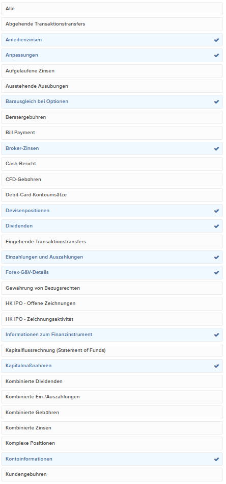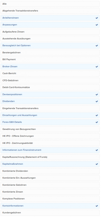 Cai Shen Mai 20, 2020 · bearbeitet Mai 20, 2020 von Cai Shen Die Seite mit den Auswertungskriterien als einen durchgehenden Bildschirmausdruck im Browser erstellen geht natürlich nicht, ich habe mal versucht die relevanten Auswahlfelder herauszustellen. Kontoverwaltung -> Berichte / Steuerdokumente -> Benutzerdefinierte Kontoauszüge Einmal erstellt, muss man trotzdem jedes Mal noch den Berichtszeitraum auswählen und das Zeitintervall auf "täglich" stellen. Entstanden ist die Auswahl im trial and error Verfahren: Ein Dokument mit allen Optionen aktiviert erstellt und dann nach und nach die überflüssigen Infos entfernt. Zur Ansicht der Zinsen gibt es mindestens 3 ähnlich funktionierende Schalter, wichtig war mir hier Gewinne und Verluste von den nicht anrechenbaren Kosten (z.B. Kreditzinsen) sichtbar zu trennen. Sollten doch mal 2 ähnlich beschriftete Kategorien mit unterschiedlichen Summen auf dem Ausdruck erscheinen, musste einer auf jeden Fall verschwinden. Ich probiere da immer noch jedes Jahr auf's Neue herum, das hier ist das Werk vom letzten Jahr. Excel brauche ich dann nur noch eine Seite Zusammenfassung, um die Summen von IB (Aktien, Fonds, Anleihen, Optionen) an das aktuelle Steuerdokument KAP angepasst zu präsentieren. Fonds packt IB nämlich untrennbar zu Aktien, was steuerlich eher ungünstig falsch ist. Du mit deinen Schrottanleihen bist da ein eher leichter Steuerfall, das ist an einem verregneten Nachmittag erledigt. Diesen Beitrag teilen Link zum Beitrag