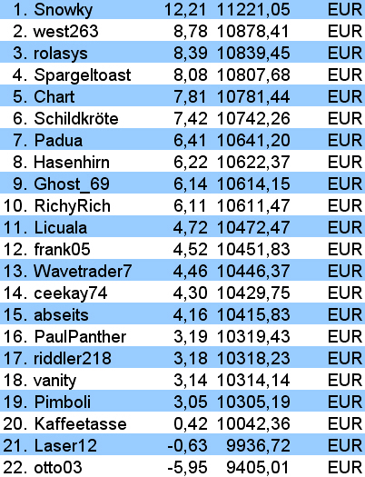 Haste auch wieder recht, anderfalls kann ich auch noch bis auf den letzten Platz zurück fallen. Na ja, wenn nichts schlimmes passiert, werden die Kurse wohl weiter steigen.