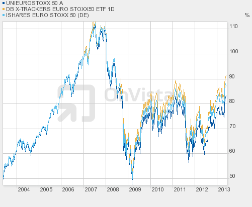Hasenhirn Mai 23, 2013 Hallo kalbi Nur mal zur Beruhigung: Dein Fonds (UniEuroStoxx 50 A) ist gar nicht so schlimm, wie das jetzt hier erscheint. Über die letzten 10 Jahre hat er sich auch nicht viel anders entwickelt als entsprechende ETFs, die oben genannt wurden (siehe mein Diagramm). Das ist eben ein indexnaher Fonds von der Art, wie sie damals häufig verkauft wurden, weil ETFs noch nicht sehr verbreitet waren und traditionelle Fondsanbieter oft keine Lust hatten, besser als die jeweils entsprechende Benchmark zu sein. Nicht gut, aber auch nicht wirklich übel. Natürlich kann man Geld bei Depotgebühren, bei Ausgabeaufschlägen, bei Transaktionskosten und bei fondsinternen Kosten sparen und damit das letzte bisschen Rendite herauskitzeln. Allerdings kannst du vor einem Verkauf auch darüber nachdenken, dass deine (kleine) Position vor 2009 erworben wurde, und dass etwaige zukünftige Kursgewinne daher nicht der gegenwärtigen Abgeltungssteuer unterliegen. Wenn du das Geld unbedingt kurzfristig verfügbar haben musst, solltest du es allerdings auf ein Tagesgeldkonto verschieben, wie Spargeltoast (hmm, lecker!) oben suggeriert hat. Alternativ könntest du dir aber auch ein preiswerteres Depot organisieren und deine Fondsanteile erst einmal dahin übertragen. Auf lange Sicht (Altersvorsorge) wäre ein breit gestreutes, rebalanciertes Weltportfolio auf ETF-Basis vernünftiger, vor allem in Verbindung mit einem pflegeleichten Sparplan; dazu gibt es hier im Forum viel zu lesen, wenn du dir die Zeit nimmst... Grüße und viel Glück, H. Diesen Beitrag teilen Link zum Beitrag