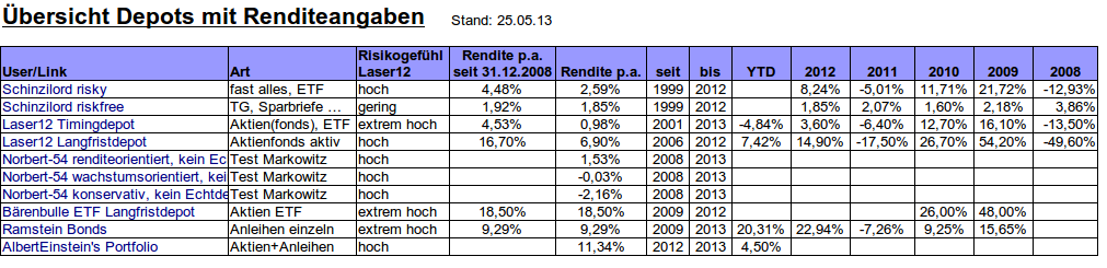 Norbert-54 Mai 28, 2013 · bearbeitet Mai 28, 2013 von Norbert-54 ok, alle Klarheiten beseitigt Könntest Du noch meine Jahresrenditen 2009 - 2012 eintragen? Danke Diesen Beitrag teilen Link zum Beitrag