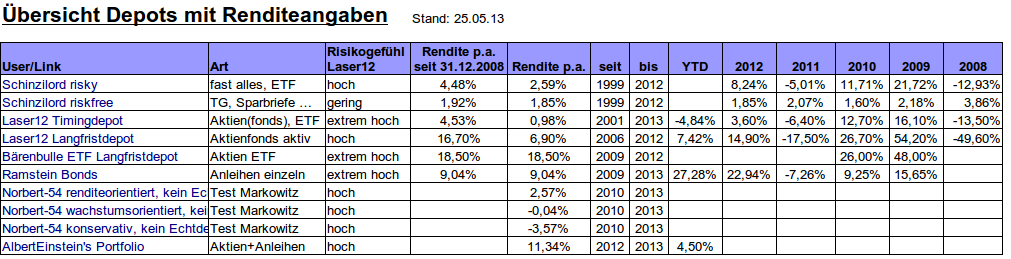 Laser12 Mai 25, 2013 Moin, ich habe eine kleine Übersicht von Musterdepots gemacht, die einfach zu übernehmende Renditeangaben enthalten. Hier kann so manchem Leser klar werden, was einzelne Vorgehensweisen an Renditen und Sorgen bringen können - auch über den Zeithorizont einer Eintagsfliege hinaus. Die Renditeangaben sind nicht immer vergleichbar. Wenn man die einzelnen Jahresrenditen hochrechnet, gibt es häufig eine Abweichung zur Rendite p.a.. Das liegt an unterschiedlichem Kapitaleinsatz im Zeitverlauf. Details bitte ich den jeweiligen Originalthreads zu entnehmen. Sortiert habe ich nach Depotstart und Rendite p.a.. Als gemeinsamen Nennen haben viele eine Rendite seit der Steuererhöhung Ende 2008 ausgewiesen. Die habe ich auch aufgenommen. Ein Teil der Daten als Grafik: Alle Daten zurück bis 1999 als PDF mit Links zu den Quellen: Depots Wertpapier-Forum 2013-05-25.pdf On Topic ist diesem Thread: - Wünsche, das weitere Depots aufgenommen werden (bitte Link als Quelle angeben) - Hinweise auf fehlerhafte Übertragung der Daten Es sind auch Diskussionen ok, sofern sie nicht besser in den jeweiligen Musterdepots geführt werden. Nicht zulassen werde ich alles, was nicht nett verstanden könnte, Glaubenskriege oder Verunglimpfungen unterschiedlicher Risikoneigungen. Diesen Beitrag teilen Link zum Beitrag