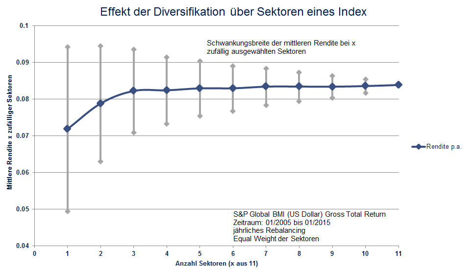 Die annualisierte Rendite ist auf der y-Achse aufgetragen. Die Fehlerbalken spiegeln die Standardabweichung der mittleren Rendite wieder - ca. 70% aller zufällig gezogenen Portfolios bestehend aus n Sektorenindizes liegen innerhalb dieser Fehlerintervalle.