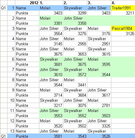 John Silver Juli 7, 2013 · bearbeitet Juli 7, 2013 von John Silver Hallo Teilnehmer der Dax Intraday Wette Q1 - Q3 2012, ich habe die Ergebnisse der Wettwochen Q1-2012 bis Q3- 2012 ausgewertet und einige fehlende Ergebnisse ergänzt. Bitte seht Euch die Auswertungen an und gibt mir bei Fehlern Rückmeldung. Die grünen Felder habe ich nachgerechnet, die anderen Daten haben ich den Wochenauswertungen von Skywalker et al entnommen. VG JS Diesen Beitrag teilen Link zum Beitrag