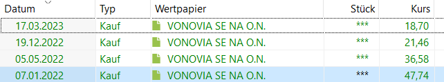 Alles Aktien Januar 12, 2024 vor 1 Minute von basti_: 2025 läuft zB eine 10jährige Anleihe (DE000A1ZY989) aus, für die man aktuell 1.5% Zinsen zahlt. Vielleicht sehe ich das falsch, aber alle in 2025 auslaufenden Anleihen haben einen Zins kleiner 2% Passiert da nicht genau das was gesagt wurde, die Zinskosten steigen? Natürlich steigen die Zinskosten, deshalb ist es auch verständlich, dass die Aktie nicht am ATH steht. Aber rechtfertigt trotzdem nicht einen Abverkauf von ~70%. Auch ist nicht klar ob sie überhaupt Refinanzieren müssen (Cash Flow + Liquidität durch Verkäufe) und wo die Zinsen in 2025+ stehen. Das Fälligkeitsprofil mit durchschnittlichen Kapitalkosten lässt sich transparent auf der IR Seite von Vonovia einsehen. vor einer Stunde von forceone: Ich bin auch recht zufrieden mit dem Management. Aber es stellt sich immer die Frage wann man so zugekauft hat, hier mal meine Historie. Der größte Zukauf war, zum Glück, am 17.03.2023. Durchschnittlicher EK liegt bei ~29 € liegen, bin also noch leicht im Minus. Gratuliere, das sieht bei mir recht ähnlich aus. Ich konnte meinen EK auf 26,62€ drücken. Wollte sogar exakt zum Tief bei 15,xx€ nochmal nachlegen, hatte mir aber als Limit ~14,5€ gesetzt und habe mich schlussendlich daran gehalten. Schade. Diesen Beitrag teilen Link zum Beitrag