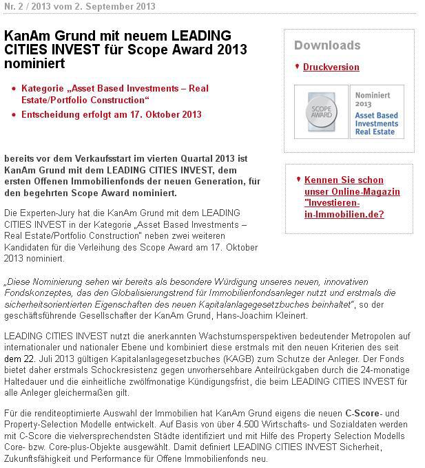 postguru August 31, 2013 KanAm Grund geht im 4. Quartal 2013 mit einem neuen offenen Immobilienfonds an den Start. Fondsinformationen Fondsgesellschaft: KanAm Grund Kapitalanlagegesellschaft mbH Fondstyp: Offener Immobilienfonds (weltweit) Fondsname: LEADING CITIES INVEST ISIN: DE0006791825 WKN: 679182 Währung: Euro (EUR) Geschäftsjahr: 1. Januar bis 31. Dezember Ertragsverwendung: ausschüttend Ausschüttungsdatum: Mai eines jeden Jahres Ausgabeaufschlag 5,5 % Auflagedatum: 15. Juli 2013 Depotbank: M.M.Warburg & CO KGaA, Hamburg Achtung Werbung: Den Metropolen gehört die Zukunft Nahezu alle Zukunftsforscher sind sich einig: Die wirtschaftlichen, gesellschaftlichen und kulturellen Möglichkeiten der großen Welt-Metropolen werden für Menschen und Unternehmen in Zukunft weiter an Bedeutung gewinnen. Genau diese Anziehungskraft macht sich der LEADING CITIES INVEST für seine Anleger zunutze. Als Offener Immobilienfonds der neuen Generation wird er die anerkannten Wachstumsperspektiven bedeutender Metropolen mit allen sicherheitsorientierten Eigenschaften kombinieren, die der Gesetzgeber ab Juli 2013 zum Schutz der Anleger festschreibt. Für die optimale Auswahl der Städte und Business-Immobilien hat KanAm Grund eigens das neue Scoring-Modell „C-Score“ entwickelt, mit dem relevante aktuelle und prognostizierte Wirtschafts- und Sozialdaten internationaler Städte und Regionen zusammengeführt werden, um die vielversprechendsten Investitionsstandorte zu identifizieren. So bietet der LEADING CITIES INVEST doppelte Vorteile für die Anleger: einerseits erstmalige Schockresistenz – d. h. Schutz vor unvorhersehbaren Anteilrückgaben – durch die 24-monatige Haltedauer und 12-monatige Kündigungsfrist für Fondsanteile andererseits größtmögliche Renditepotenziale durch die daten- und faktenbasierte Objektauswahl LEADING CITIES INVEST definiert Sicherheit, Zukunftsfähigkeit und Performance neu. Privaten Anlegern wird er ein innovatives und attraktives, mittel- bis langfristiges Investment mit aussichtsreichen Wachstums- und soliden Rendite-Perspektiven bieten. Diesen Beitrag teilen Link zum Beitrag