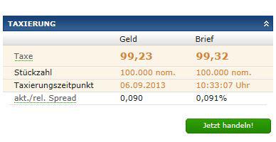 ceekay74 September 6, 2013 · bearbeitet September 6, 2013 von ceekay74 Ist der Spread nicht ungewöhnlich..?? Geld 10.000........Brief 100.000 Äh? Welche WKN an welcher Börse? Diese hier? Die 100k Briefvolumen zu 99,32 stammen eventuell vom Makler und die 10k Geld zu 99,30 vom privaten kaufwilligen Kleinanleger? Die Makler-Geldseite sollte wie an den anderen Handelsplätzen um 99,23 liegen und 100k betragen. EDIT: Nach dem Umsatz zu 99,30 sieht die Welt wieder besser aus: Diesen Beitrag teilen Link zum Beitrag