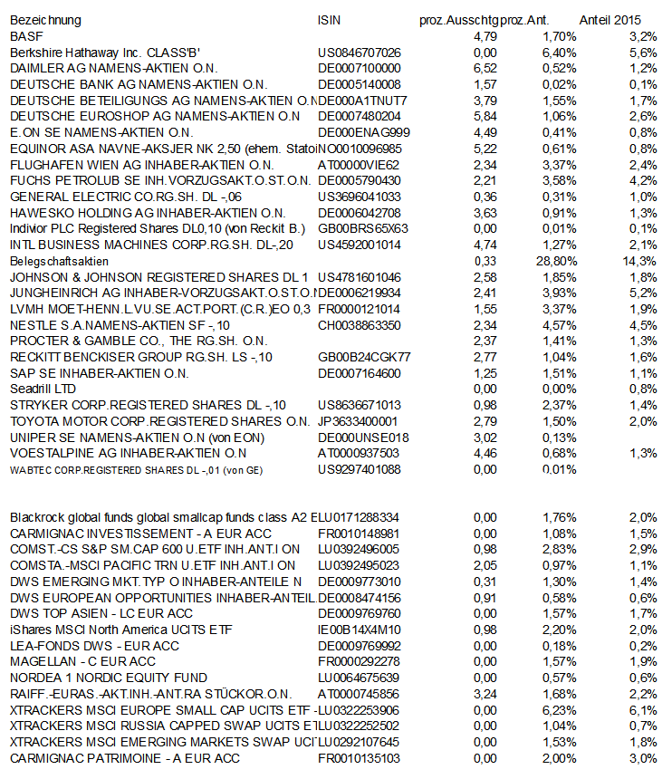 Sapine April 3, 2015 Das aktuelle Depot besteht aus 25 (27) Einzelaktien und 16 Fonds. Bis auf geringfügige Anteile in VL-Fonds handelt es sich um steuerliche Altanlagen aus 2008 und älter. Daher bleibt das Depot auch weiterhin vergleichsweise statisch. 66,8% Einzelaktien 18,7% Aktienfonds DM 8,1% Aktienfonds EM 3,0% Mischfonds 3,4% Liquidität Die Ausschüttungsquote nach Steuern lag 2014 bei knapp 1 %. Einzelaktien DE000BASF111 3,2% BASF SE NAMENS-AKTIEN O.N. US0846707026 5,6% BERKSHIR.HATHAWAY INC.RG.SH.B NEW DL -,00333 DE0007100000 1,2% DAIMLER AG NAMENS-AKTIEN O.N. DE0005140008 0,1% DEUTSCHE BANK AG NAMENS-AKTIEN O.N. DE000A1TNUT7 1,7% DEUTSCHE BETEILIGUNGS AG NAMENS-AKTIEN O.N. DE0007480204 2,6% DEUTSCHE EUROSHOP AG NAMENS-AKTIEN O.N. DE000ENAG999 0,8% E.ON SE NAMENS-AKTIEN O.N. AT0000911805 2,4% FLUGHAFEN WIEN AG INHABER-AKTIEN O.N. DE0005790430 4,2% FUCHS PETROLUB SE INH.VORZUGSAKT.O.ST.O.N. US3696041033 1,0% GENERAL ELECTRIC CO.RG.SH. DL -,06 DE0006042708 1,3% HAWESKO HOLDING AG INHABER-AKTIEN O.N. GB00BRS65X63 0,1% INDIVIOR PLC REGISTERED SHARES DL0,10 US4592001014 2,1% INTL BUSINESS MACHINES CORP.RG.SH. DL-,20 US4781601046 1,8% JOHNSON & JOHNSON REGISTERED SHARES DL 1 DE0006219934 5,2% JUNGHEINRICH AG INHABER-VORZUGSAKT.O.ST.O.N. DE0006483001 2,7% LINDE AG INHABER-AKTIEN O.N. FR0000121014 1,9% LVMH MOET-HENN.L.VU.SE.ACT.PORT.(C.R.)EO 0,3 CH0038863350 4,5% NESTLé S.A.NAMENS-AKTIEN SF -,10 US7427181091 1,3% PROCTER & GAMBLE CO., THE RG.SH. O.N. GB00B24CGK77 1,6% RECKITT BENCKISER GROUP RG.SH. LS -,10 DE0007164600 1,1% SAP SE INHABER-AKTIEN O.N. BMG7945E1057 0,8% SEADRILL LTD.REGISTERED SHARES DL 2,- NO0010096985 0,8% STATOIL ASA NAVNE-AKSJER NK 2,50 US8636671013 1,4% STRYKER CORP.REGISTERED SHARES DL -,10 JP3633400001 2,0% TOYOTA MOTOR CORP.REGISTERED SHARES O.N. AT0000937503 1,3% VOESTALPINE AG INHABER-AKTIEN O.N. Usxxxxxxxxx 14,3% US-Belegschaftsaktie Aktienfonds FR0010148981 1,5% CARMIGNAC INVESTI.AEO ACC FUNDS DE0009769992 0,2% LEA-Fonds DWS LU0171288334 2,0% BGF - GLOB.SMALLCAP FD.ACT.NOM.CL.A2 EUR ON DE000A0J2060 2,0% ISHS-MSCI N. AMERIC.UCITS ETF BE.SH.(DT.ZT.) LU0392496005 2,9% COMST.-MSCI USA SMA.CP.T.U.ETF INH.ANT.I ON LU0064675639 0,6% NORDEA 1-NORDIC EQ.FD.ACT.NOM.BP-EUR O.N. LU0322253906 6,1% DB X-TR.MSCI EU.SM.C.I.ETF DR INH.ANT.1C ON DE0008474156 0,6% DWS EUROPEAN OPPORTUNITIES INHABER-ANTEILE LU0392495023 1,1% COMSTA.-MSCI PACIFIC TRN U.ETF INH.ANT.I ON DE0009769760 1,7% DWS TOP ASIEN INHABER-ANTEILE LU0292107645 1,8% DB X-TR.MSCI EMER.MKTS.IDX.ETF INH.ANT.1C ON DE0009773010 1,4% DWS EMERGING MARKETS TYP O INHABER-ANTEILE FR0000292278 1,9% MAGELLAN SICAV ACTIONS C (EUR) O.N. AT0000745856 2,2% RAIFF.-EURAS.-AKT.INH.-ANT.RA STÜCKOR.O.N. LU0322252502 0,7% DB X-TR.MSCI RUSSIA C.I.U.ETF INH.-ANT.1C ON Mischfonds FR0010135103 3,0% CARMIGN.PATRIMOI. AEO ACC FUNDS Liquidität xxxxxxxxxxxx 3,4% Liquidität Diesen Beitrag teilen Link zum Beitrag