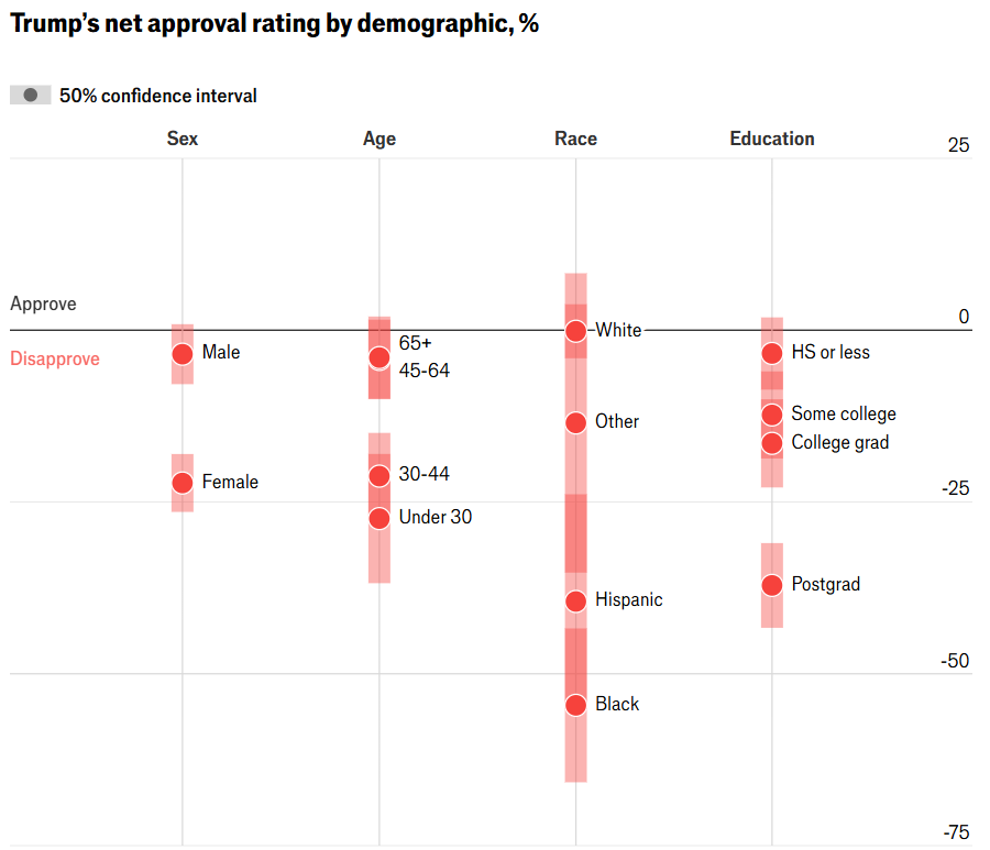 Sapine April 24, 2025 Das Meinungsforschungsinstitut YouGov hat im Economist die aktuellen Zahlen zur Popularität von Trump im Zeitverlauf der ersten 100 Tage veröffentlicht. Ging deutlich nach unten auf aktuell -13 %. https://www.economist.com/interactive/trump-approval-tracker Auch interessant fand ich welche Gruppen ihn mehr oder weniger unterstützen. Diesen Beitrag teilen Link zum Beitrag