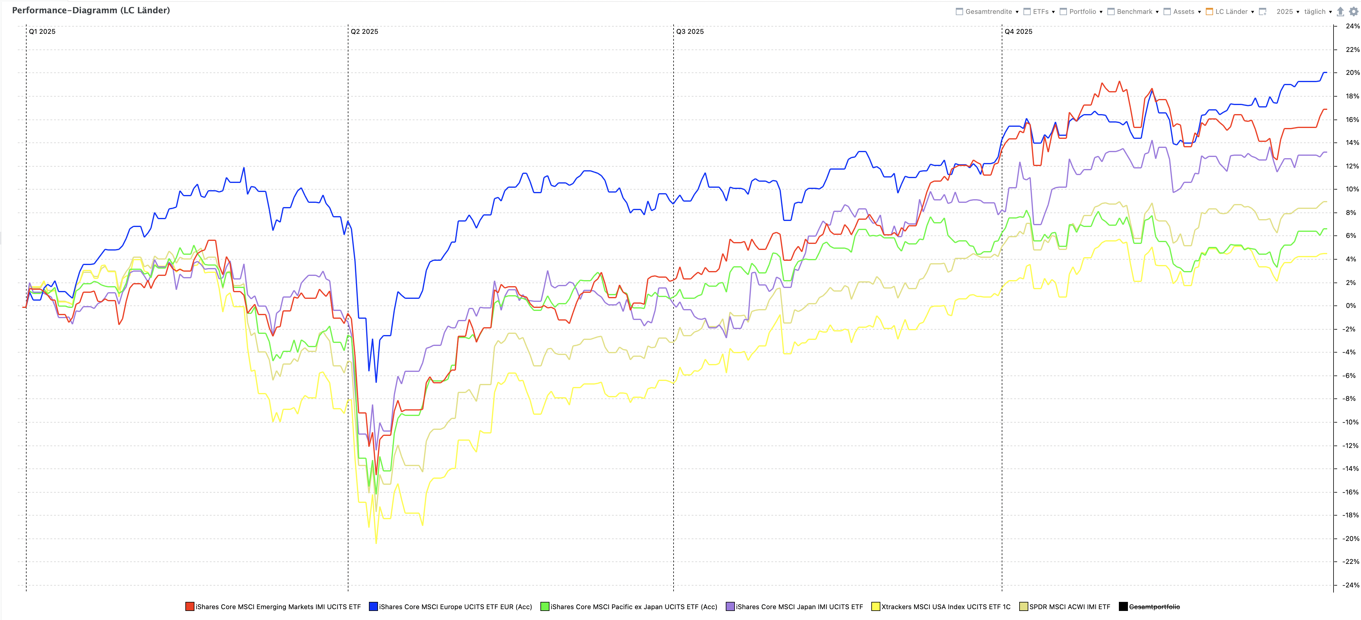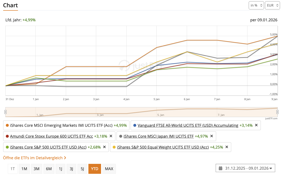 Bast gestern um 10:54 Uhr vor einer Stunde von rotten.demin: Der Stoxx 600 und die EM sind schon besser gelaufen als die Jahre zuvor. Eine starke Unterperformance von US-Aktien war halt währungsbedingt und nur für EU-Anleger gegeben. Nein, der Post ist von Oktober, aber immer noch aktuell: Am 22.10.2025 um 15:19 von chirlu: Richtig. Die Währung, in der man es betrachtet, hat allerdings nur Auswirkung auf die konkreten Zahlen. Dass BIP heuer deutlich besser läuft als Marktkapitalisierung, gilt in jeder Währung. (Zum Beispiel ist der MSCI North America in Dollar bei +15,6%, optisch sehr viel besser als bei Betrachtung in Euro. Der MSCI Europe in Dollar dann allerdings bei +29,8%, der MSCI Emerging Markets bei +31,3%.) vor 41 Minuten von No.Skill: Ich hab's nicht gemacht und einfach weiter laufen lassen, und die Leute mit weniger USA-Gewichtung und mehr EU/Asien haben scheinbar im „Wie war 2025 für euer Depot“-Faden auch mehr Rendite. Die USA (gelb) haben 2025 im Vergleich zu EU/Japan/EM/Pacific ex Japan deutlich schlechter abgeschnitten: vor 47 Minuten von Kai_Eric: Vielleicht mal konkreter gefragt: Seid ihr wegen des Themas Rechtssicherheit bei Geldanlagen in den USA oder in US Unternehmen besorgt und habt ihr bereits oder plant ihr künftig, euer Anlageverhalten daraufhin zu ändern? Nein, ich bleibe bei einer Regionengewichtung nach BIP. Diesen Beitrag teilen Link zum Beitrag