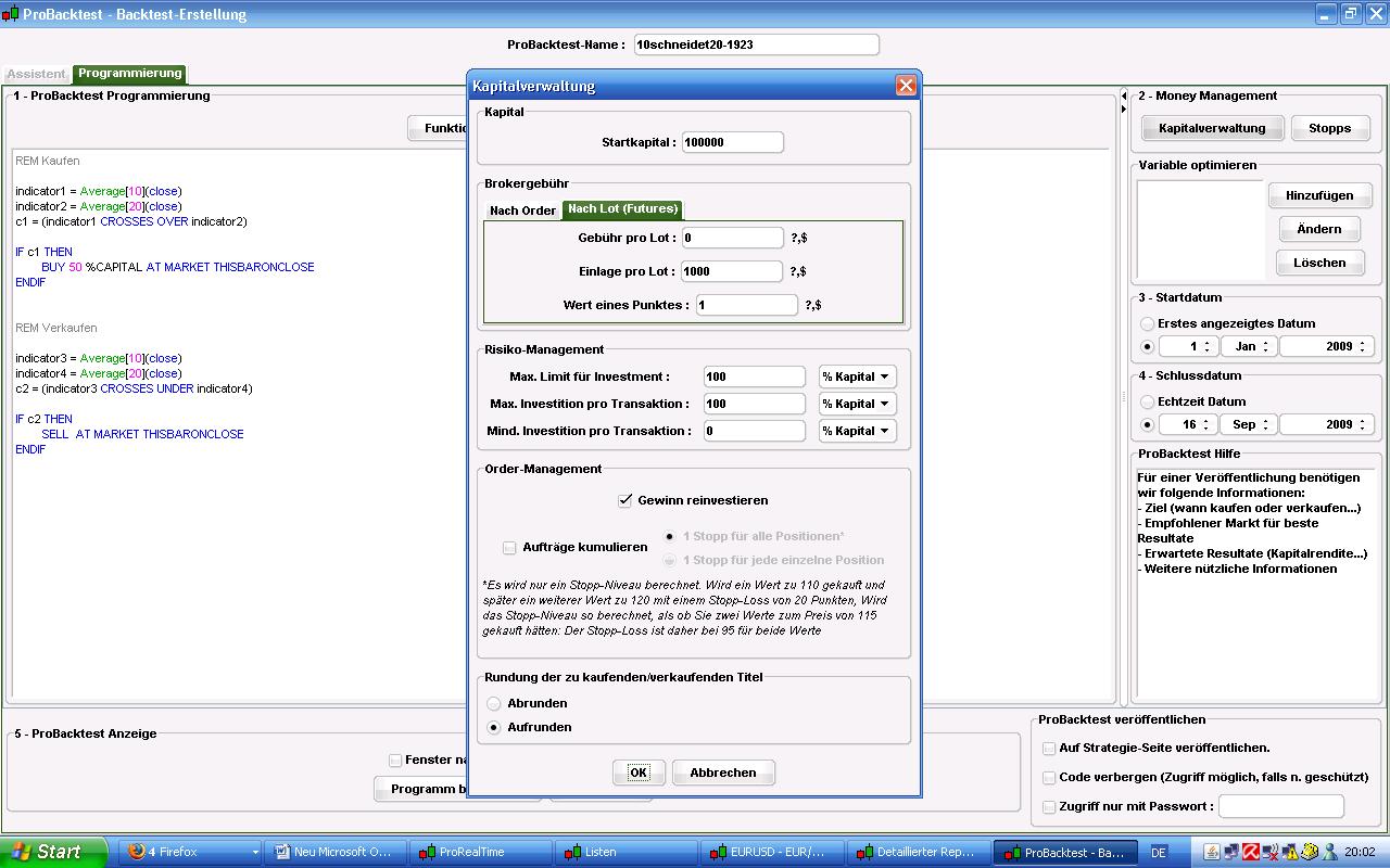 WarrenBuffet1930 September 20, 2009 Hallo Santander, sehr guter Hinweis! :thumbsup: :thumbsup: Aber ich verstehe die Felder nicht: Einlage pro Lot: ein Lot sind 100.000, soll das der Hebel sein, also Hebel 1:100 = 1.000 Einlage? Wert eines Punktes: Soll das 1 Pips sein? Max. Limit für Investment: verstehe ich überhaupt nicht Max. Investition für Transaktion: ??? was soll da rein? Mind. Transaktion pro Investition: ??? was soll da rein? Wie stellt man ein, dass man z.B. immer 100.000 investiert ohne Gebühren und aufaddiert wird nur der prozentuale Wert 100.000 investiert: 1% gewonnen 100.000 investiert 0,5% gewonnen usw so dass am ende dann 1,5% rauskommt? Diesen Beitrag teilen Link zum Beitrag