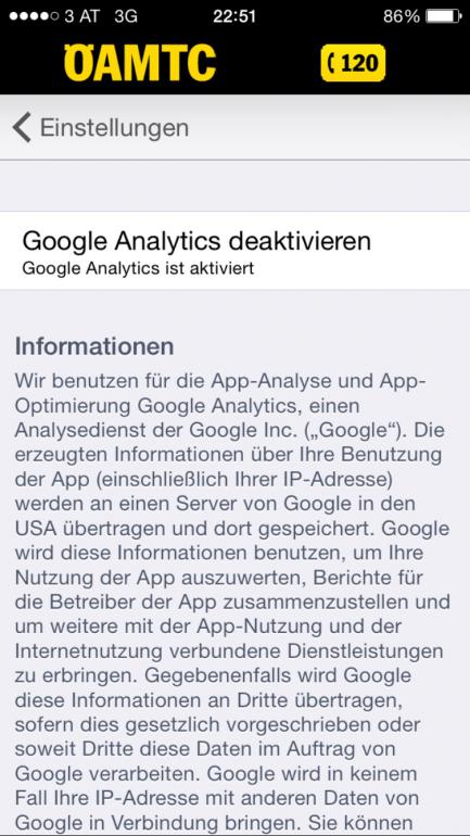 Gast250913 April 8, 2015 · bearbeitet April 8, 2015 von 3mg4 Da würde mich interessieren, inwiefern Google ein Profil von Nutzern erstellen kann, die Google-Skripte per No-Script oder ähnliche Add-ons blockiert haben und Google nicht als Suchmaschine nutzen. Woher bekommen sie eventuell noch Informationen? Weiß nicht ob das der richtige Thread dafür ist, darum nur kurz: In wie weit die solche Skripts greifen kann ich jetzt ad hoc nicht beurteilen, die IP zB verschleiern sie aber nicht, zumindest ist mir keines bekannt, also werden sie es über diese machen, bin aber sicher eine kurze Webrecherche bringt da mehr Licht ins dunkle Wie sie Infos über dich bekommen, zB jeder der sein Adressbuch über Google "synct" und dich eingespeichert hat schickt ihnen einen Datensatz von dir, oft sehr detailliert, je nachdem wie genau dich die Person eingespeichert hat (Name, Adresse, GebDatum, Tel# etc) Kurz zu solchen AdBlocker und Skript Blocker ein interessanter Link bzgl. dem doppeltem Geschäft von Ghostery ->Heise.de Link EDIT: Oder ganz einfach über eine App am Smartphone, gerade per Zufall entdeckt, der ÖAMTC (ähnlich wie ADAC in D) verwendet zur Analyse seiner App Google Analytics, interessant der Text dazu, siehe Anhang Diesen Beitrag teilen Link zum Beitrag