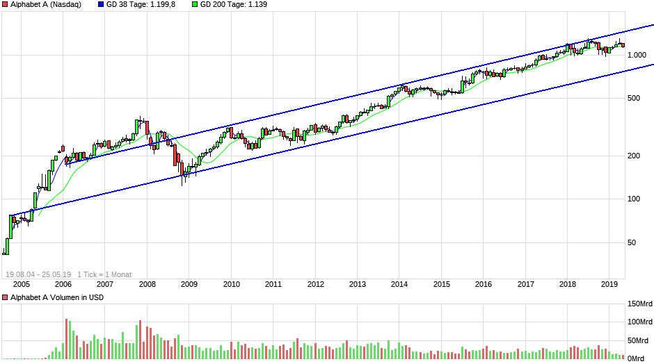 DAX43 Mai 25, 2019 Das schöne an der Charttechnik ist doch, jeder kann Striche ziehen, die er für seine Meinung braucht. Meinen Chart würden Prediger des Börsen Crashs nehmen. Also Alphabet Kauf bei ca. 600 $ Diesen Beitrag teilen Link zum Beitrag