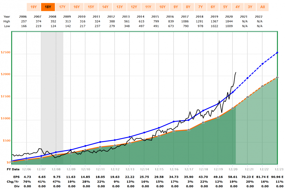 Kai_Eric März 17, 2021 · bearbeitet März 17, 2021 von Kai_Eric Am 12.3.2021 um 08:00 von Toni: Bewertungs-Update: Laut FASTgraphs ist die Aktie nur sehr leicht überbewertet: Der Gründer von Fastgraphs, Chuck Carnevale, empfiehlt, die ersten Jahre nicht in der Auswertung zu berücksichtigen, wenn sie extremes Wachstum aufweisen. Jahr 1 und 2 in dieser Auswertung beinhalten 260% Wachstum. Das verzerrt die Berechnung der Durchschnitte, auch wenn es ein langer Zeitraum ist. Nimmst du die beiden ersten Jahre heraus, hast du etwa 20% Überbewertung: Startest du noch mal 3 Jahre später im Jahr 2009, weil dann die Wachstumsraten alle in einem vergleichbaren Bereich liegen, ergibt sich eine Überbewertung von 30-40%. Betrachtet man den Operating Cash Flow siet es etwas besser aus. Dann sind es noch 10-15% Überbewertung wenn man aus besagten Gründen im Jahr 2008 startet. Aber bei dem Wachstum, was immer noch hingelegt und auch in den kommenden Jahren prognostiziert wird, kann ich mch aktuell noch nicht zum Verkauf durchringen. Diesen Beitrag teilen Link zum Beitrag