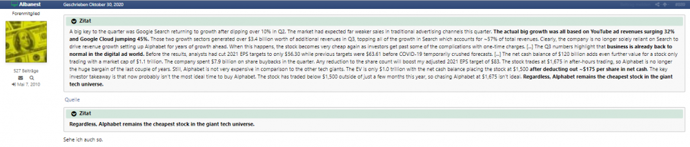 Albanest April 19, 2021 · bearbeitet April 19, 2021 von Albanest vor 16 Stunden von berti123: Ich verstehe, dass man den geneigten Viewer nicht beeinflussen will, aber ein Minimum an Side-Infos zu Youtube Videos wäre hilfreich selbst wenn das nur die Adjektive bullish/bearish sind. Unabhängig davon, dass alle Videos von Sven Carlin sehenswert, kurzweilig und informativ sind, was erwartest du dir von einem "bullish" / "bearish" von Toni (oder von Sven)? Der Case ist doch für jeden Investor, abhängig von seinen Erwartungen, anders. Viel wichtiger sind doch Informationen, die hier gespeichert/geteilt werden mit allen, die an dem Unternehmen interessiert sind... Eine Meinung kann (und sollte) sich jeder selbst darüber bilden. Von daher, danke fürs sharen @Toni vor 20 Stunden von Wuppi: Lasst uns diskutieren! Okay. Ich fange an: Zur Aktie: Die Aktie hat sich seit dem Tief im März knapp verdoppelt und war lange der laggard unter den Big Tech Unternehmen - siehe dazu uA mein Post #889 aus dem Oktober 2020: Seit dem ist Alphabet ordentlich gelaufen, ich halte die Aktien aber weiterhin (Eine meiner ältesten noch im Depot befindlichen Aktien). Wenn ich Alphabet noch nicht hätte und freie Mittel zur Verfügung hätte, würde wohl auch jetzt noch kaufen. In meinem Depot macht Alphabet rund 5% aus und ist damit bereits ganz ordentlich repräsentiert, also eine "hold" Position. Eine Aufstockung drängt sich aber derzeit nicht bei mir auf. Zum Unternehmen Aktie: Google search-engine & Ads sind die Basis. Youtube, Android, Waymo und die Other bets sind dazu für mich die cherry auf dem cake. Das Unternehmen wird mE gut geführt. Der CEO wird nach meinem Geschmack etwas zu fürstlich bezahlt. Aber solange er und sein Team liefert - fine. Diesen Beitrag teilen Link zum Beitrag
