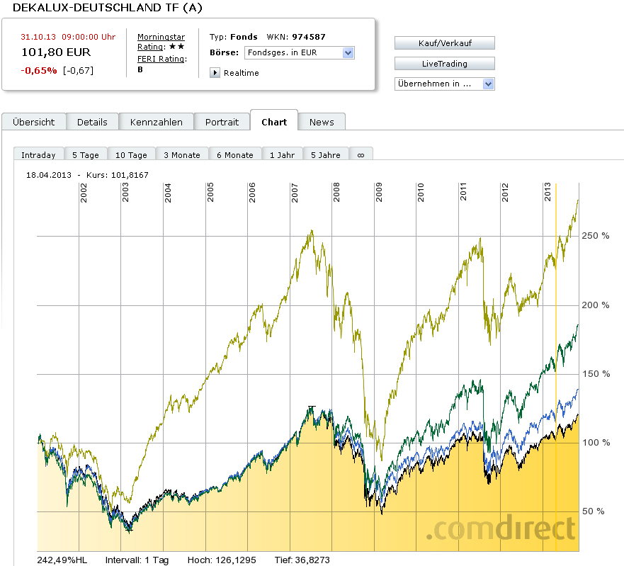 ghost_69 November 2, 2013 Hallo und Willkommen hier im Forum Südseetraum Gut das Du den Weg zu uns gefunden hast. Ja die Spaßkasse so sind sie eben, es gibt keine Berater, das sind nur Verkäufer die nur ihre eigenen Produkte verkaufen dürfen. Ja der DAX war keine so schlechte Geldanlage, doch schaue Dir Deinen Chartvergleich mal genauer an. Der Fonds der Sparkasse bleibt hinter der Benchmark zurück, warum denn nicht gleich die Benchmark kaufen, ist eh günstiger. Hier mal ein Chart: schwarz = DEKA Spaßfonds blau = DAX duneklgrün = anderer Hausbankenfonds hellgrün = unabhängiger Deutschlandfonds Dazu überlege was diese Anlage kostet, es gibt da verschiedene Gebühren und wenn dann nicht alles in einem Topf, etwas verteilen ist immer gut. Ghost_69 :- Diesen Beitrag teilen Link zum Beitrag