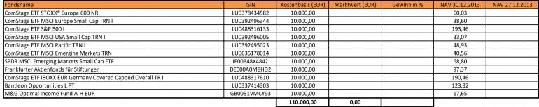 ghost_69 Dezember 31, 2013 Regeln: - Jeder Teilnehmer hat exakt 11 Fonds in seinem Portfolio. - Das Startguthaben betrug 110.000,- €, in jeden Fonds wurden 10.000,- € investiert. - Jeder Teilnehmer darf maximal drei Mal switchen. - Ausgabeaufschläge und Mindestanlagen werden nicht berücksichtigt. Es können sowohl die Fonds aus dem letzten eh meine diesen Jahr 2013 genommen werden oder aber eine ganz neue Mannschaft auf den Rasen geschickt werden. Ghost_69 :- Diesen Beitrag teilen Link zum Beitrag