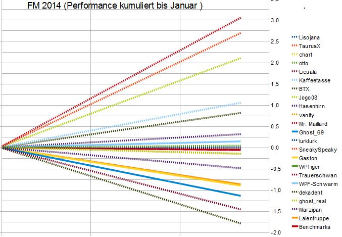 wertpapiertiger Februar 1, 2014 Keinen Bock mehr, morgen nehm ich Excel und xlquotes So lange können wir aber nicht warten. Mit dem letzten veröffentlichten Ergebnis liegt der der WPF-Schwarm bei erfreulichen 0,15%, während die Benchmark eine tiefrote -0,05% eingespielt hat. Es fehlen jetzt noch die liebreizende Lisojana, der taumelnde Taurus, der schartige Chart sowie - wie immer - der tingelnde Tiger. AmphiDeka vermeldet ein Ergebnis von -0,14% (per 30.01, dafür KAG-geprüft. Ultimo-Nachmeldung folgt am Montag). Hier schon die grafische Aufbereitung der Daten (ohne die Nachzügler), diesmal für die schlichten Gemüter unter uns och menno. ist doch noch viel zu früh im Jahr den Tingelpokal verabreicht zu bekommen. Klarer Fall von Frontrunning Das Tigerdepot liegt vorerst weiter müde auf der Lauer. Grüsse Diesen Beitrag teilen Link zum Beitrag