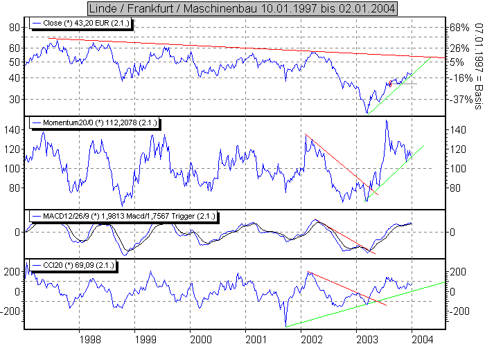 Aktiencrash Januar 5, 2004 Die Linde Aktie befindet sich seit Aug/1997 in einem langfristigen Abwärtstrend (rot). Bisher hat die Aktie es immer bis zu Abwärtstrend geschafft. Im Augenblick befinden sich alle Indikatoren in der Nähe ihrer pos. Konvergenzen (grün). Es ist somit gut möglich, das es einen neuen Kursschub geben könnte Richtung Norden. Die Aktie selber befindet sich auch an ihrem kurzen Aufwärtstrend. Fazit: Jetzt sollte sich zeigen ob die Aktie noch Potenzial bis zum langfristigen Abwärtstrend hat (50-53 ). Diesen Beitrag teilen Link zum Beitrag