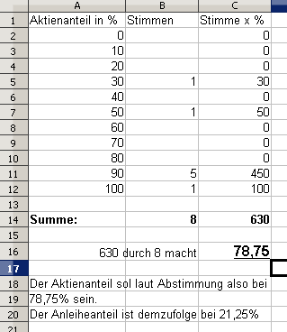 chartprofi Dezember 10, 2013 · bearbeitet Dezember 10, 2013 von chartprofi Die GEwichtung zwischen Anleihen und Aktien wird so berechnet, dass nicht die Prozente mit den meisten Stimmen gewinnen, sondern ein Mittelwert gesucht wird. Dieser wird so berechnet wie in folgendem Bild zu sehen ist. So hat jede STimme einfluss auf die Depotgestaltung und auch die Minderheits-Stimmen werden berücksichtigt Jede Position wird mit ca. 5% eröffnet, wobei keine Nachkäufe und teilverkäufe getätigt werden. Bis das Depot voll ist werden jede woche 4 Positionen aufgebaut. ich bitte um eure Favoriten für die erste Abstimmung einfach hier in diesen Faden schreiben was ihr kaufen würdet Bitte nur Vorschläge aus diesem Anlageuniversum: http://www.wikifolio...geuniversum.xls Diesen Beitrag teilen Link zum Beitrag