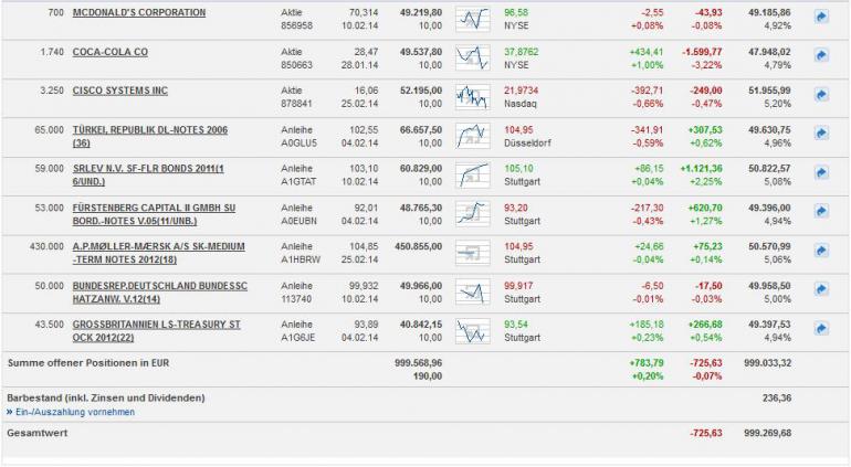 chartprofi Februar 4, 2014 Die Abstimmung ist vorbei und hier einsehbar https://www.wertpapier-forum.de/topic/43091-abstimmung-anleihen-aktien-kw514/?do=findComment&comment=869911 Es haben 15 Leute abgestimmt, aber es wurden nur 11 Abstimmungen gezählt ... da das bei jeder Abstimmung passiert, sollte sich da mal jemand drum kümmern Die Entscheidung ob man bei STimmengleichheit per Zufall, oder kennzahlenbasiert entscheiden soll ist gefallen. Mit nur einer STimme Vorsprung wurde entschieden, dass in Zukunft eine Kennzahl beim "Stechen" entscheidet. Bitte schlagt hier Kennzahlen vor ... in der nächsten Abstimmung wird entschieden nach welcher Kennzahl wir uns in Zukunft richten werden ... So ist die Quotenabstimmung gelaufen Es sollen laut Abstimmung also 14 Aktienpositionen und 6 Anleihepositionen mit je 5% Kapitaleinsatz aufgebaut werden. Bei den Aktien haben wir mit Procter&Gamble nur eine einzigen 100%igen EInzugskandidaten ... 6 weiter Aktien haben die gleiche Anzahl Stimmen erhalten ... hier werde ich so verfahren wie beim letzten mal ... die Werte werden nicht ins Depot kommen und haben nächgste Woche wieder eine Chance. Bei den Anleihen gibt es für 3 Werte eine klare Entscheidung ... hier verfahre ich so wie mit den Aktien Das Depot sieht nun so aus Diesen Beitrag teilen Link zum Beitrag