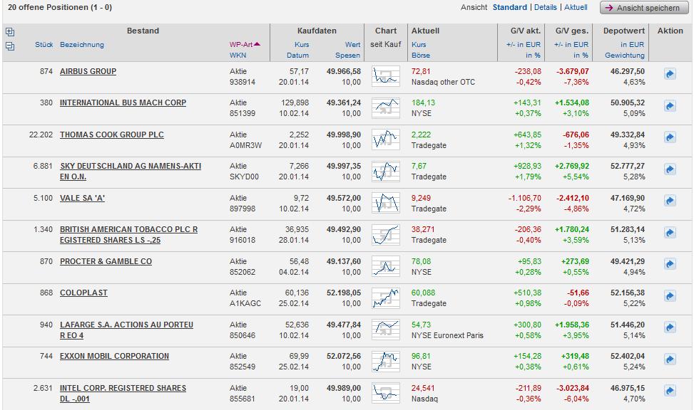 chartprofi Februar 25, 2014 So ... das Depot sieht so aus Cisco hat mit Abstand das geringste KGV und darf ins Depot ... da Coloplast ins Depot einzieht wird es wahrscheinlich kein "0815 Standard-blablub-Depot" Wer glaubt, dass es bessere Wertpapiere gibt, als die im Depot befindlichen, der sollte sie hier posten und nächste Woche wird abgestimmt welche Werte getauscht werden. Wenn keine Vorschläge eingehen, dann ist das Depot "perfekt aufgestellt" Diesen Beitrag teilen Link zum Beitrag