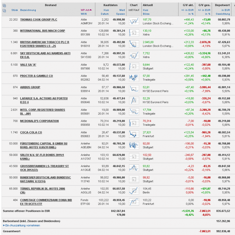 chartprofi Februar 25, 2014 · bearbeitet Februar 25, 2014 von chartprofi ja, sapine ... das interesse hat kürzlich etwas nachgelassen Die Abstimmung ist vorbei und hier einsehbar www.wertpapier-forum.de/topic/43249-abstimmung-anleihen-aktien-kw-8-14 Eine deutliche Mehrheit möchte sich bei der Abstimmung für ein einzelnes Wertpapier entscheiden und keine Mehrfachnennung. Als Anleger ist man ständig gezwungen Entscheidungen zu treffen und sich zwischen subjektiv gleich guten Werten entscheiden. Daher finde ich es recht gut, dass das auch in diesem Depot beibehalten werden kann. Die Quotenabstimmung hat 68% Aktien und 32% Anleihen ergeben. Derzeit sind ca. 542463 EUR (55%) in Aktien investiert, 299514 EUR (30%) in Anleihen und 157.262 EUR (15%) sind noch flüssig. Das bedeutet, dass wir 3 weitere Aktienpositionen zu je 5% aufbauen. Bei den Anleihen wird der Anleihe-ETF gegen den Sieger der Anleihe-Kaufabstimmung ( A.P.Møller-Mærsk ) getauscht. So sind wir den ETF auch losgeworden ... ab jetzt werden ausschließlich echte Anleihen gehandelt. Da bei drei potenziellen Aktien-Einzugskandidaten Stimmengleichheit besteht, werde ich die kgv aus zeitmangel später prüfen ... daher wird das depot ebenfalls später bestückt .... wenn die kgv-geschichte jemand übernehmen will, dann würde ich mich freuen ... wenn du mit mir dieses Depot managen möchte, dann schick mir bitte eine Nachricht, dann bekommst du die Zugangsdaten und kannst das depot und die beiträge bearbeiten Wer Vorschläge (Aktien und ANleihen) für die Abstimmung am nächsten Wochenende parat hat, der kann sie in diesen Fred schreiben. Wenn das Abstimmungsergebnis umgesetzt wurde, ist das Depot im "Normal-Modus" angekommen. Die Startphase ist vorbei und nun werden wir sehen, ob die Intelligenz der Mehrheit so gut zwischen Aktien und Anleihen switchen kann, dass wir eine Qutperformance erleben werden ... oder ob die Mehrheit in seinen Ansichten so festgefahren ist, dass man keine signifikanten unterschiede zwischen den Marktphasen erkennen kann Vielen Dank an alle, die durch ihre Aktivität zum überstehen der Startphase beigetragen haben. Diesen Beitrag teilen Link zum Beitrag