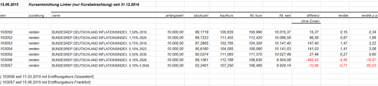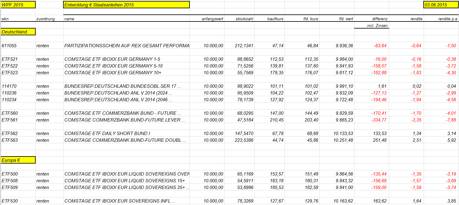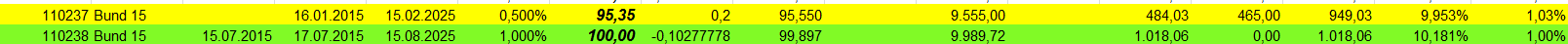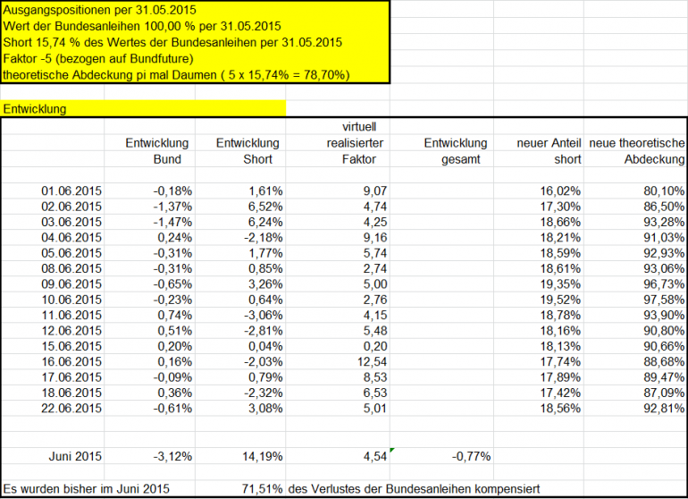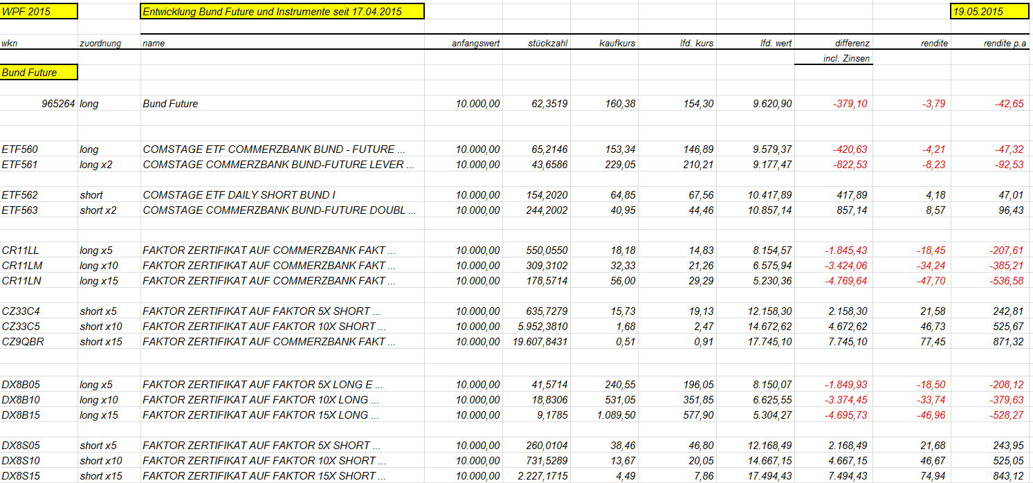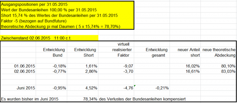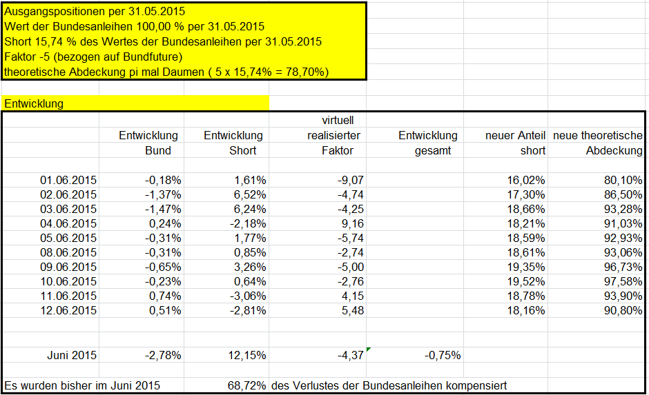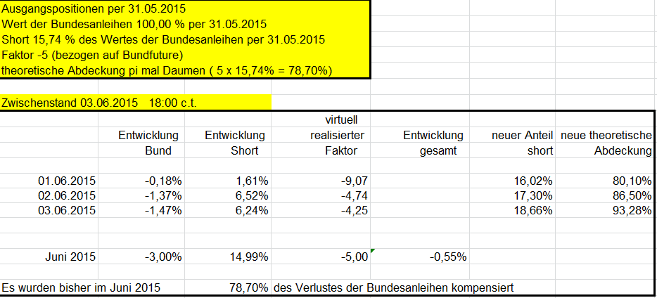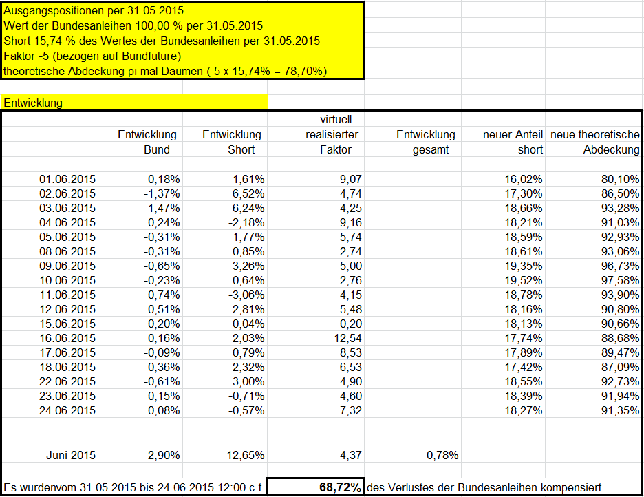 otto03 Juni 2, 2015 Versuchsanordnung mit realen im Bestand befindlichen Werten Juni 2015 Kann man einen Bestand von Bundesanleihen durch ein gehebeltes Shortinstrument neutralisieren? Wertentwicklung der 4 letzten Bundesanleihen 10j (Volumen in identischem Nennwert, aber natürlich unterschiedlichem Kurswert) incl. Zinsen gegenüber einem short Zertifikat auf den Bund Future fünffach gehebelt (der Hebel wird wie üblich täglich zurückgesetzt) Basis der Berechnungen jeweils: Kursdaten Onvista 18:00 c.t. Bundesanleihen 110233, 110235, 110236, 110237 - keine Kosten Zertifikat DX8S05, Kosten des Zertifikats 0,50% p.a., Kosten des gehebelten Short Bundfuture sind implizit enthalten https://www.xmarkets.db.com/DE/Download/Flyer/DE000DX8S053 wird fortgesetzt Diesen Beitrag teilen Link zum Beitrag