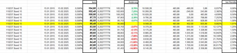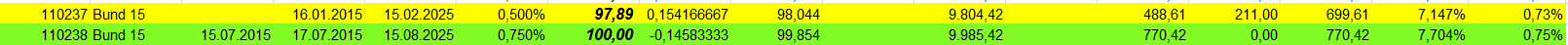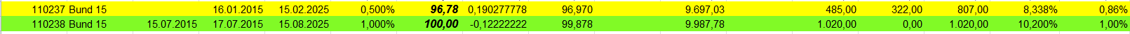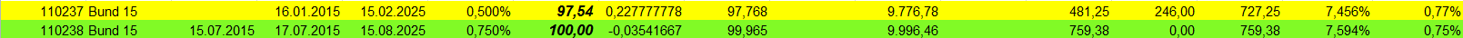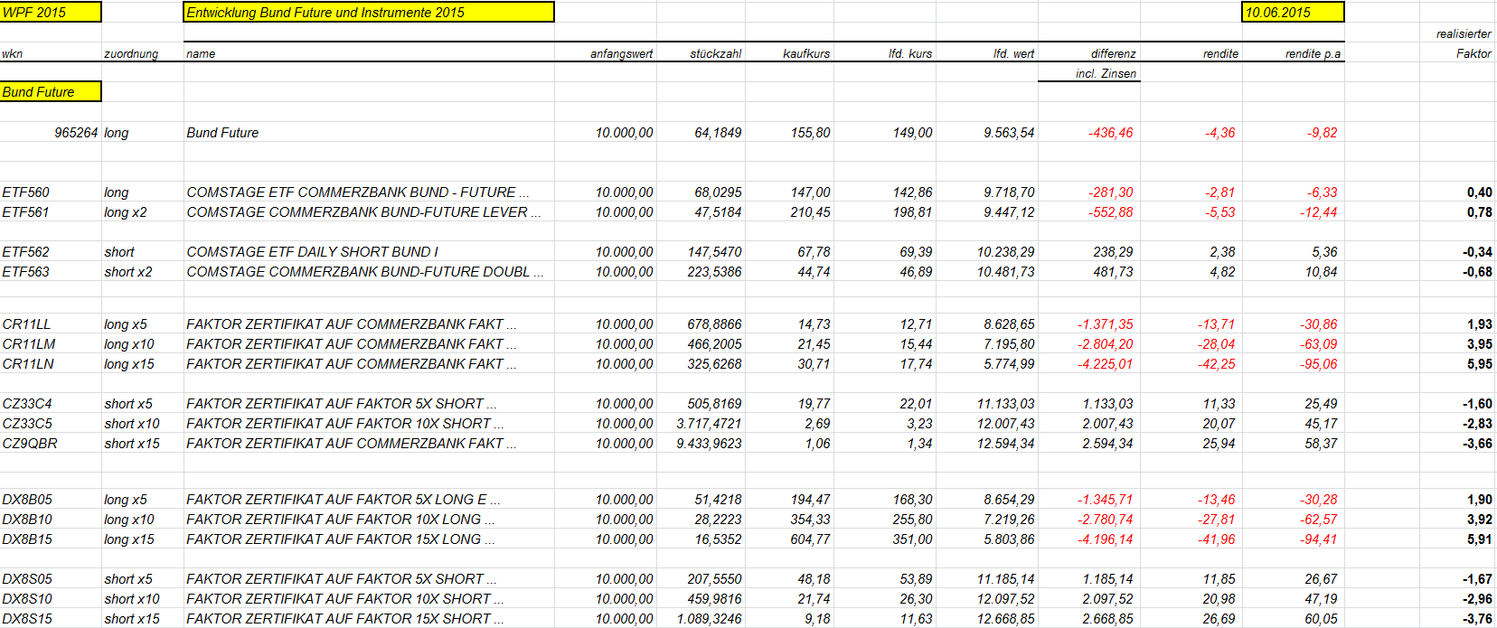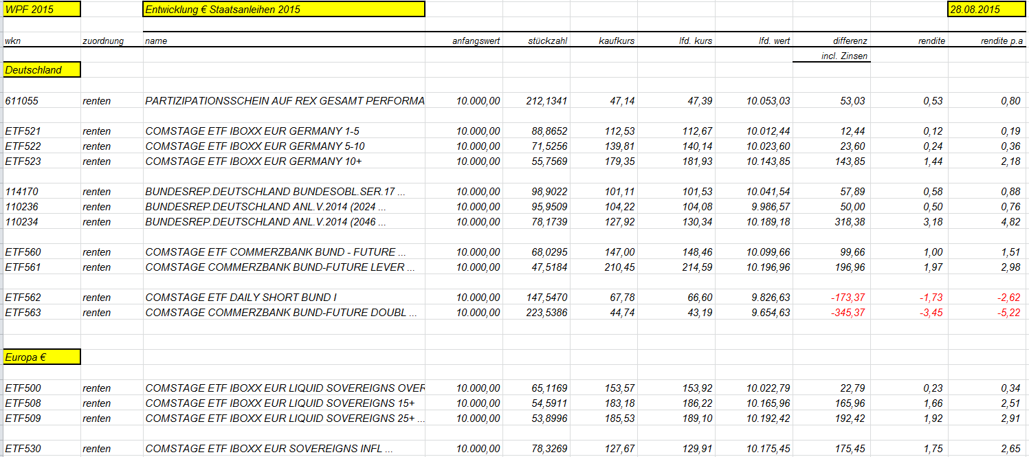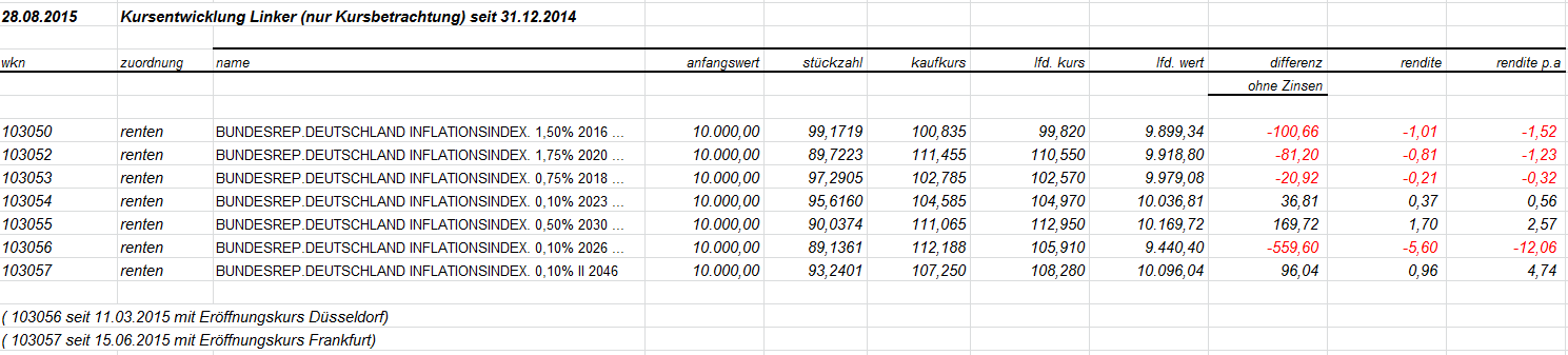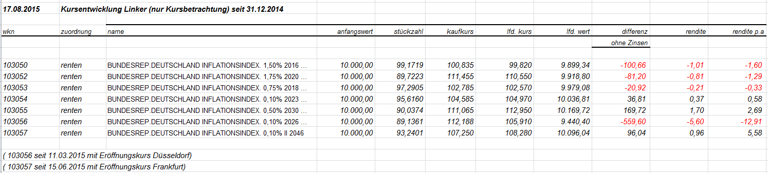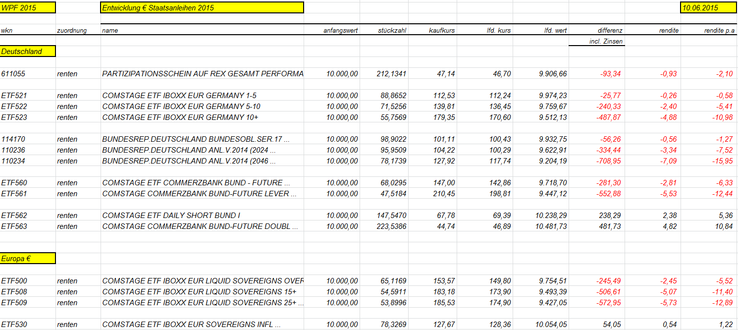 otto03 Juni 2, 2015 Versuchsanordnung mit realen im Bestand befindlichen Werten Juni 2015 Kann man einen Bestand von Bundesanleihen durch ein gehebeltes Shortinstrument neutralisieren? Wertentwicklung der 4 letzten Bundesanleihen 10j (Volumen in identischem Nennwert, aber natürlich unterschiedlichem Kurswert) incl. Zinsen gegenüber einem short Zertifikat auf den Bund Future fünffach gehebelt (der Hebel wird wie üblich täglich zurückgesetzt) Basis der Berechnungen jeweils: Kursdaten Onvista 18:00 c.t. Bundesanleihen 110233, 110235, 110236, 110237 - keine Kosten Zertifikat DX8S05, Kosten des Zertifikats 0,50% p.a., Kosten des gehebelten Short Bundfuture sind implizit enthalten https://www.xmarkets.db.com/DE/Download/Flyer/DE000DX8S053 wird fortgesetzt Diesen Beitrag teilen Link zum Beitrag