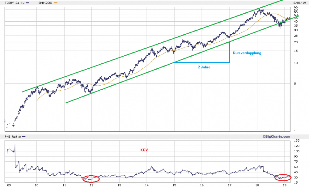 Toni März 7, 2019 TA für Tencent: Beeindruckender Chart, Verdopplung alle 2 Jahre. Könnte jetzt ein Kauf sein, günstig vom KGV her, unterer Rand des Aufwärtstrendkanals gerade so verteidigt in den letzten Monaten.... Diesen Beitrag teilen Link zum Beitrag
