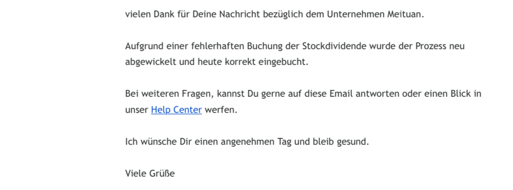 forceone Januar 11, 2023 vor 2 Stunden von Steinlach: Bei mir wurden die Meituan Aktien heute bei traderepublic wieder ausgebucht, ohne dass ich irgendwas beauftragt habe. Ist das sonst noch bei jmd so? Bei mir auch Diesen Beitrag teilen Link zum Beitrag