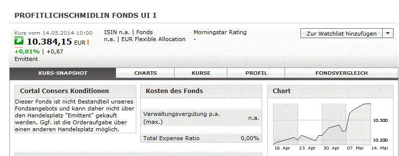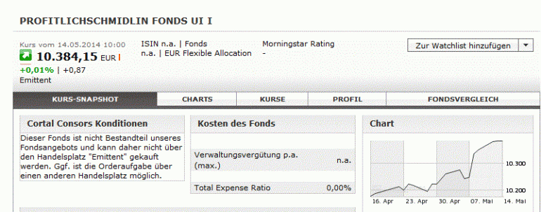 Akaman Mai 16, 2014 P.S.: Bei Consors ist der Begriff „ProfitlichSchmidlin“ kürzlich aus der Suchmaschine verschwunden und auch Fondsgesellschaft und ISIN werden nicht mehr angezeigt (siehe Foto). Man findet die Fondskurse nur noch durch Direkteingabe von WKN/ISIN. Habe keine Ahnung, was das bedeutet. Technischer Fehler oder knallharte Provisionsverhandlungen? Ich habe über CC gekauft. Bei mir war es dazu nötig, per E-Mail um die Freischaltung zu bitten. Diesen Beitrag teilen Link zum Beitrag