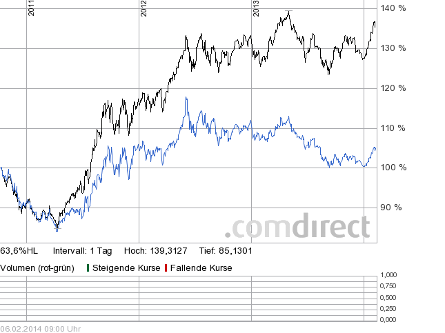 Maciej Februar 10, 2014 ... was wären die Vorteile von gehebelten Kurzläufern gegenüber den Langläufern? Kürzere Laufzeiten = geringere Zinssensitivität, aber auch andere Renditeerwartung. Es kommt stark auf die Zinsstruktur an, ob sich das lohnt oder nicht. Es trägt aber auch zur Diversifizierung bei. Interessant ist, dass die kurzen Laufzeiten historisch fast immer die allerhöchsten Sharpe-Ratios hatten. Je kürzer desto "sharper". Dass die kürzerlaufenden mit geringeren Kursschwankungen als die Langläufer reagieren verstehe ich. Wenn du schreibst die Sharpe-Ratio ist zudem höher, hieße das ja folgendes: Würde man die Kurzläufer auf die gleiche Volatilität wie die Langläufer hebeln, wäre letztlich die Rendite höher als bei den Langläufern, richtig? Die Frage wäre nur, ob die Überrendite hier nicht wieder durch die Finanzierungskosten beim Hebeln aufgefressen wird (langfristig gesehen meine ich). Nur mal ein kurzer Blick auf einen Vergleich der Entwicklungen des Comstage Bund Lev. (schwarz) und einer dt. Staatsanleihe mit ca. 20 Jahren Restlaufzeit (blau) zeigt eine höhere Volatilität der gehebelten Anleihen (wobei der Betrachtungszeitraum leider relativ eingeschränkt ist): Da hätte ich jetzt erwartet, dass eine doppelt hebelte 10jährige Anleihe eine ähnliche Volatilität wie eine einfache 20jährige haben sollte. Ein Blick auf ZappBrannigans ersten Graph zeigt auch, dass eine Verdoppelung der Laufzeit nicht einfach eine Verdoppelung der Rendite und ein doppelter Hebel nicht immer die gleiche Rendite wie die doppelte Laufzeit bringt. So einfach scheint die Berechnung also nicht zu sein. Im Sinne des HBPP finde ich diese gehebelte Variante allerdings deutlich interessanter, da man anscheinend mit weniger Kapitaleinsatz eine ähnlich hohe oder sogar höhere Volatilität bekommt als mit 25% Langläufern. Diesen Beitrag teilen Link zum Beitrag