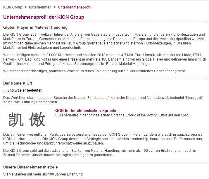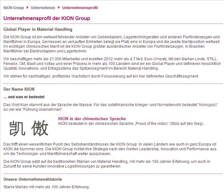 John Silver März 2, 2014 KION Group AG KION GROUP AG Abraham-Lincoln-Straße 21 DE-65189 Wiesbaden Telefon+49-611-770-0 Fax+49-611-770-269 Email: silke.glitza@kiongroup.com Internet: www.kiongroup.com Link: http://www.kiongroup.com/de/main/kion_group/company.jsp Link zur IR mit den Finanzberichten Unternehmensprofil Gabelstapler für den Weltmarkt Die KION GROUP AG ist ein deutscher Anbieter von Logistiklösungen, Lagertechnik- und Flurförderzeugen, vor allem aber von Gabelstaplern. Das Produktportfolio reicht von der Entwicklung, Fertigung und dem Vertrieb von Service- und Systemlösungen bis hin zu Finanzierungsangeboten. Seitdem das chinesische Joint Venture KION Baoli (Jiangsu) 2009 in die KION-Gruppe integriert werden konnte, ist der Konzern nicht nur Marktführer in Europa sondern auch der größte ausländische Gabelstaplerproduzent in China. Die Produkte der Gruppe werden unter den Marken Linde, STILL, Fenwick, OM-STILL, Baoli und Voltas MH in 111 Ländern weltweit vertrieben. KION produziert in 15 Produktionsstätten in neun Ländern. Hinzu kommen elf Forschungs- und Entwicklungszentren sowie mehr als 1.100 Vertriebs- und Servicestützpunkte. Im Material Handling sieht sich der Konzern als Global Player und reklamiert für sich einen führenden Platz in den Bereichen Qualität, Innovationen und Ertragsstärke. Während die beiden Marken Linde und STILL als globale Marken positioniert wurden, gelten Fenwick (Frankreich) und OM-STILL (Italien) wie auch Baoli (China und Schwellenländer) als regionale Marken. Das operative Geschäft untergliedert der Konzern in die Segmente "Linde Material Handling" (LMH), "STILL", "Financial Services" (FS) und "Sonstige". Das Segment "LMH" steht dabei für rund zwei Drittel der Konzernumsätze. Im Segment "Linde Material Handling" (LMH) fasst der Konzern die Marken Linde, Fenwick und Baoli zusammen. Generell hat KION im Segment "LMH" das Premium-Geschäft konzentriert, wobei die reklamierte Technologieführerschaft mit den hydrostatischen und dieselelektrischen Antrieben sowie mit Produktinnovationen auch im Bereich energieeffizienter und emissionsarmer Antriebstechnologien begründet wird. Das Produktportfolio der Premium-Marke Linde reicht von Lagertechnikgeräten bis hin zu Schwer- und Containerstaplern für alle wesentliche Einsatzgebiete und bietet in den Bereichen Technologie, Wirtschaftlichkeit, Funktionalität und Design hohe Standards. In Frankreich verkauft Linde seine Produkte unter der Marke Fenwick. Mit Baoli deckt der Konzern das untere Preissegment in China und den Wachstumsmärkten in Asien, Osteuropa, dem Nahen Osten und Afrika wie auch Süd- und Mittelamerika ab. Seitdem KION die Mehrheit an Linde Hydraulics Ende 2012 verkauft hat, wird diese zuvor hier konsolidierte Gesellschaft nur noch at Equity konsolidiert. Über einen exklusiven Liefervertrag hat sich KION allerdings die Versorgung mit diesen Komponenten gesichert, die die Grundlage für die präzisen Hub- und Fahreigenschaften der KION-Produkte bilden. Im Segment "LMH" konnten die Erlöse 2012 um 9,8% auf 3,13 (i.V. 2,85) Mrd. Euro wachsen. Das Ergebnis vor Zinsen und Steuern (EBIT) lag bei 523,4 (257,7) Mill. Euro und konnte damit mehr als verdoppelt werden. Bereinigt um Kaufpreisallokationen und Einmaleffekte lag es bei 330,4 (279,4) Mill. Euro. Im Segment "STILL" sind die beiden Marken STILL und OM-STILL vereinigt. STILL ist ein global aufgestellter Premium-Anbieter von Gabelstaplern und Lagertechnikgeräten mit dieselelektrischen Antrieben und fokussiert sich auf den europäischen und lateinamerikanischen Markt. Weiteres Wachstum in Asien ist anvisiert. Als Anbieter von Intralogistik-Lösungen ermöglichen die STILL-Produkte das Zusammenspiel von Gabelstaplern, Lagertechnik und Schleppern sowie von Mehrwertdienstleistungen im Bereich innerbetriebliche Logistikprozesse, Regalsysteme und Flottenmanagement. Im Segment "STILL" lagen die Erlöse 2012 mit 1,68 (1,67) Mrd. Euro nur marginal über dem Vorjahreswert. Das EBIT kam auf plus 98,10 (minus 5,09) Mill. Euro voran. Bereinigt gibt der Konzern es mit 122,6 (100,2) Mill. Euro an. Im Segment "Financial Services" (FS) hat der Konzern neuerdings das Finanzierungsgeschäft angesiedelt, das den Vertriebsarm mit seinen Finanzierungsangeboten für Kunden unterstützt. In zentralen Vertriebsmärkten wie Deutschland, Frankreich, Italien, Spanien und Großbritannien hat der Konzern eigene Finanzierungsgesellschaften eingeführt. Generell umfasst das Segment die interne Finanzierung der kurzfristigen Mietflotte und andererseits die Finanzierung des Leasinggeschäfts für die Kunden der KION Group. Das Segment erzielte 2012 einen Umsatz von 509,3 (479,8) Mill. Euro und ein Vorsteuerergebnis von 4,80 (6,16) Mill. Euro. Dabei kam das Leasingvolumen auf 997,0 (906,0) Mill. Euro voran. Im Segment "Sonstige" hat der Konzern die Holdingfunktionen der KION Group und damit seine Aktivitäten in der Informationstechnologie (IT) und u.a. in der Logistik zusammengefasst. Hinzu kommt das Geschäft mit der Marke Voltas MH, die Gabelstapler und Lagertechnik für den indischen Markt anbietet. Die Erlöse im Segment "Sonstige" kletterten auf 250,9 (223,3) Mill. Euro, wobei das EBIT bei minus 12,17 (plus 43,43) Mill. Euro lag. Bereinigt gibt es der Konzern mit 44,43 (67,97) Mill. Euro an. 2012 gelang der Turnaround in die Gewinnzone Der Konzern blickt auf eine beständige Wachstumsgeschichte zurück. Auch 2012 konnten in allen Wesentlichen Absatzregionen Marktanteile gewonnen und das Servicegeschäft ausgebaut werden. Auch dank der positiven Entwicklung der Segmente konnten die Erlöse 2012 weiter um 8,2% auf 4,73 (i.V. 4,37) Mrd. Euro und damit stärker als anvisiert expandieren. 2012 entfielen 56% der Umsätze oder 2,65 (2,36) Mrd. Euro auf das Neugeschäft. Weitere 40% oder 1,91 (1,83) Mrd. Euro erzielte der Konzern mit Service-Dienstleistungen wie dem Vermieten von Geräten und 4% oder 168,0 (173,0) Mill. Euro entfielen auf Hydraulikkomponente