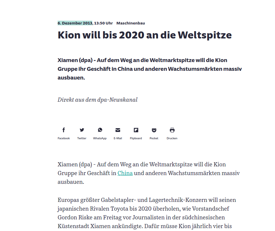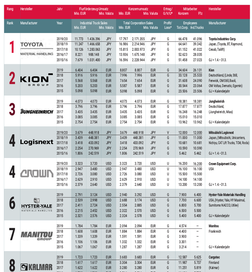 boersenschwein Januar 15, 2021 · bearbeitet Januar 15, 2021 von boersenschwein Toyota Material Handling (TMHG, Tochter von Toyota Industries Corp JP3634600005) ist auch weiterhin Weltmarktführer im Sektor Flurfördertechnik. KION Group bleibt weiter auf Platz No2 (Weltrangliste Flurförderzeuge 2019/2020 17. Dezember 2020) Diesen Beitrag teilen Link zum Beitrag
