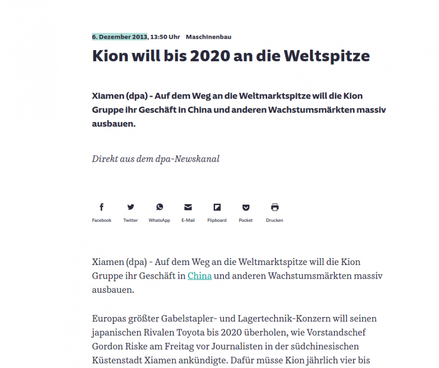 boersenschwein September 14, 2022 Eigenzitat vom 15.1.2021 um 22:48:50 in einer anderen Gruppe. (TMHG, Tochter von Toyota Industries Corp JP3634600005) ist auch weiterhin Weltmarktführer im Sektor Flurfördertechnik. KION Group bleibt weiter auf Platz No2 (Weltrangliste Flurförderzeuge 2019/2020 17. Dezember 2020) Darum wird #KION immer nur den zweiten Platz belegen. Toyota hat ein erheblich günstigeres Preisniveau bei gleicher Qualität und Serviceleistung. Das Ziel von KION wurde bereits zu 2018 verfehlt. Platz 1 wird auch künftig nicht erreichbar werden. Ein kleiner Mittelstand kommt gegen ein Weltkonzern nicht an KION bleibt im Kurs massiv überbewertet Mit einbrechenden Märkten bzw Rückgängen und ausweitender Rezession bekommt KION und Jungheinrich nun massive Probleme. Sollte sich langfristig auch die Thematik Produktion, Lieferketten und Lagerung nach Pandemie, Ukraine Krieg, Energiekrise und Umweltfragen langfristig wandeln werden Unternehmen wie dieses weiter Druck erfahren. Toyota kann dergleicehn leichter verkraften, ist ja nur ein Baustein von vielen in dem Konzern. Diesen Beitrag teilen Link zum Beitrag