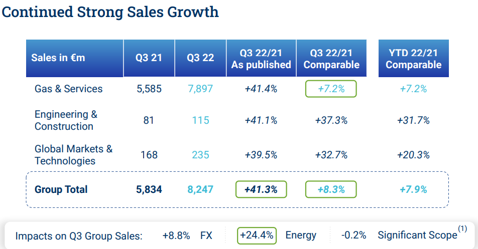 Air Liquide konnte die zuletzt stark gestiegenen Energiepreise an seine Kunden weiterreichen und verbuchte im ersten Quartal laut eigenen Angaben einen Umsatz von 6,89 Milliarden Euro, was einem Anstieg von 29 Prozent entspricht oder 7,9 Prozent auf vergleichbarer Basis.