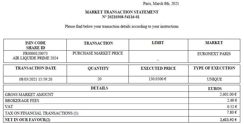 west263 November 6, 2024 vor 9 Minuten von Owl: heute in der post vom Broker. was hat es damit auf sich? ich habe mich gerade mal in mein Depot direkt bei Air Liquide eingeloggt und da gibt es sowas nicht. (nach näherer Suche auch kein Wunder) https://www.finanzen.net/unternehmensprofil/air_liquide_prime_fidelite Das müsste die Aktie sein, die nur an der Pariser Börse handelbar ist und das ist die, die in meinem Depot eingebucht ist. Diesen Beitrag teilen Link zum Beitrag
