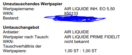 Owl November 6, 2024 heute in der post vom broker. was hat es damit auf sich? Zitat für Ihre Wertpapiere gibt es einen freiwilligen Umtausch zu den folgenden Konditionen: Umzutauschendes Wertpapier Wertpapiername: AIR LIQUIDE INH. EO 5,5 WKN: 850133 Bestand: xx Umtauschangebot Anbieter: AIR LIQUIDE Wertpapier nach Tausch: AIR LIQUIDE PRIME FIDELIT WKN: nicht bekannt Tauschverhältnis der Wertpapiere: 1,00 ST : 1,00 ST Mindestannahmestückzahl Die Annahme des freiwilligen Umtauschangebots ist nur für 1 Inhaberaktie und einem Vielfachen davon Diesen Beitrag teilen Link zum Beitrag