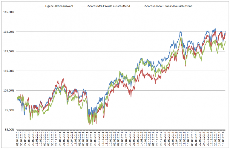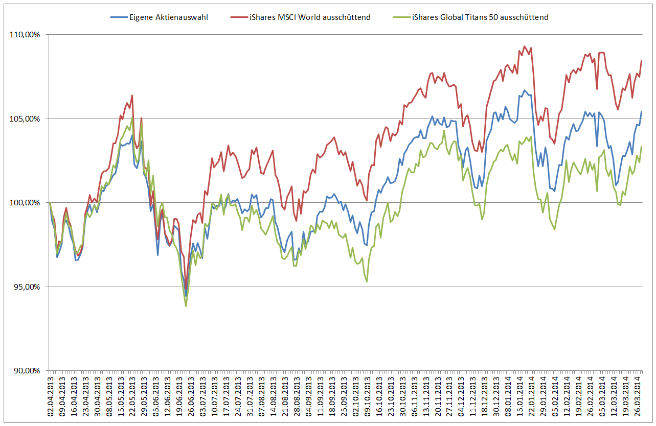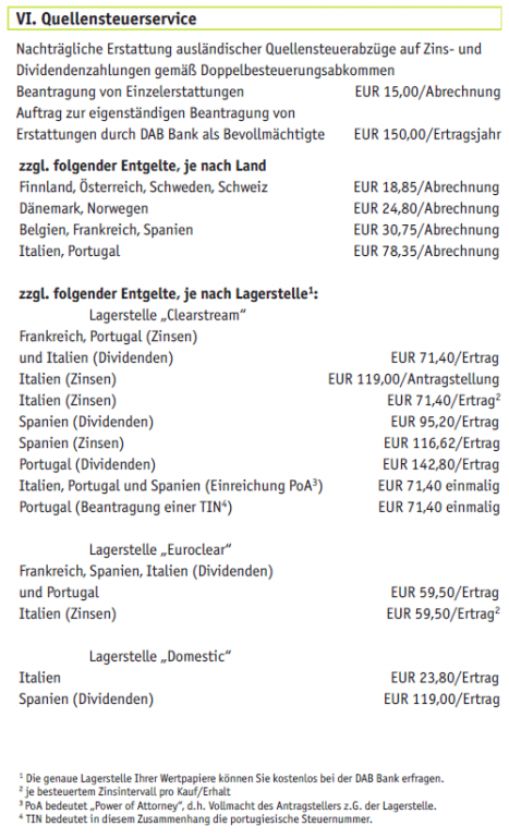 Hamsterrad April 3, 2014 Hmm... Ich stelle gerade fest, das sich 30 der 50 von mir ausgesuchten Unternehmen auch im Global Titans 50 wiederfinden, wobei diese 30 für 61,32% des Indexes verantwortlich sind. Die Unterschiede bei den restlichen Unternehmen kommen hauptsächlich durch die "vielen" deutschen Werte bei mir zustande. So kanns gehen... ich habe mittels tagelanger Recherchen und Tests zu über 60% einen Index nachgebaut, den ich bereits im Depot halte. Auf den Global Titans 50 hatte ich gesetzt, um die großen Werte dieser Welt überzugewichten. Eigentlich ist der iShares ETF perfekt. Steuereinfach da inländisch, dazu replizierend und ausschüttend. Allerdings liegt die TER bei 0,51%, 40% der Werte weichen ab, ich kann die Gewichtung der Unternehmen nicht selbst bestimmen und die Auschüttungsrendite des Index ist niedriger (z. B. aufgrund google). Wäre eigentlich mal eine Idee für ein Weltdepot 70% Global Titans 50 und 30% BRIC 50 (den es aber nur von Ishares gibt und der steuerhäßlich ist) Achte unbedingt darauf, dass Dir keiner Geld abnimmt für ausländische Dividenden wie etwa bei Flatex. Möglicherweise zahlt sich auch die Unterstützung bei der Quellensteuer aus. Ich habe mir die Umschichtungskosten bei der DAB Bank einmal ausgerechnet. Sie liegen ungefähr auf der Höhe der TER für ein Jahr. Allerdings würde es sich für das Geld auch lohnen, ein Umschichtungsdepot aufzumachen (z. B. Cortal Consors 12 Monate 4,95 Euro pro Trade). Lagerstelle soll die DAB Bank bleiben, unabhängig davon wo ich letztlich kaufen werde. Es gibt bei der DAB auch einen Quellensteuerservice. Was dieser wirklich kosten würde, habe ich allerdings nicht verstanden. Aus dem Preis-/Leistungsverzeichnis: Diesen Beitrag teilen Link zum Beitrag