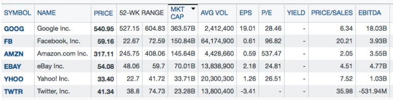 Ramstein April 11, 2014 Trivial kann man in 1-2 Minuten über Yahoo Finance eine 1. Übersicht erstellen, z.B. Da kann man dann zu den einzelnen Firmen noch jede Menge Infos abrufen, bis hin zu Analystenmeinungen und Schätzungen. Was mehr soll man hier finden? Außer den Meinungen der Foristi natürlich. Diesen Beitrag teilen Link zum Beitrag