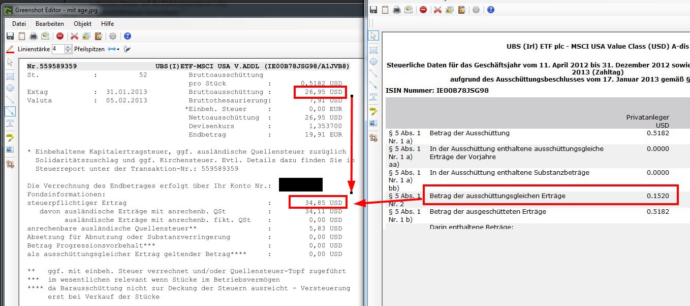 big.bud99 April 13, 2014 Wenn es sich um eine Ausschüttung handelt, dann sind die ausschüttungsgleichen Erträge, die ausgewiesen werden, bereits versteuert, so dass nichts separat erklärt werden muss. Eben genau das dachte ich bisher auch. Auf dem Ausschüttungs-Beleg "Ertragsmitteilung" des Brokers fehlen aber die agE. Habe jetzt mal ein Beispiel mit Versteuerung der agE (UBS) und ein Beispiel ohne Versteuerung der agE angehängt (SPDR). Wenn Du die KAP-Bemessungsgrundlage mit den ausgeschütteten Erträgen vergleichst, wird sich in Höhe der agE eine Differenz ergeben. In der Abrechnung des UBS ja, in der Abrechnung des SPDR nein. Diesen Beitrag teilen Link zum Beitrag