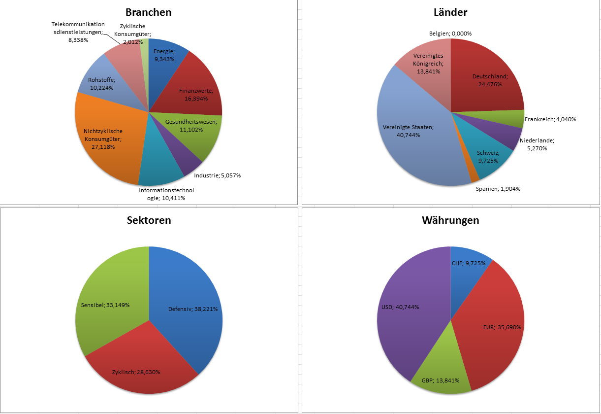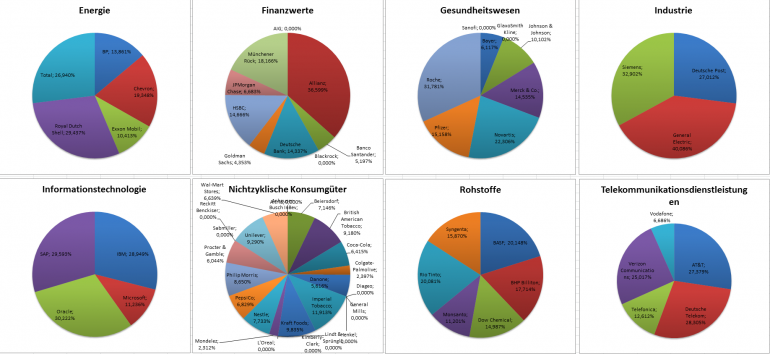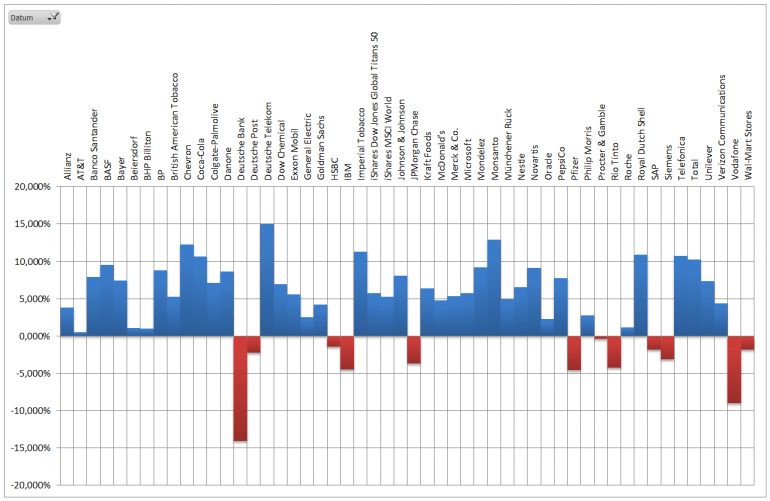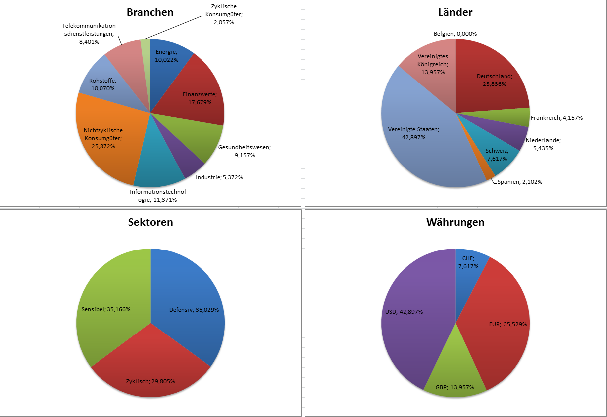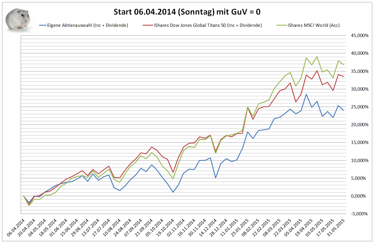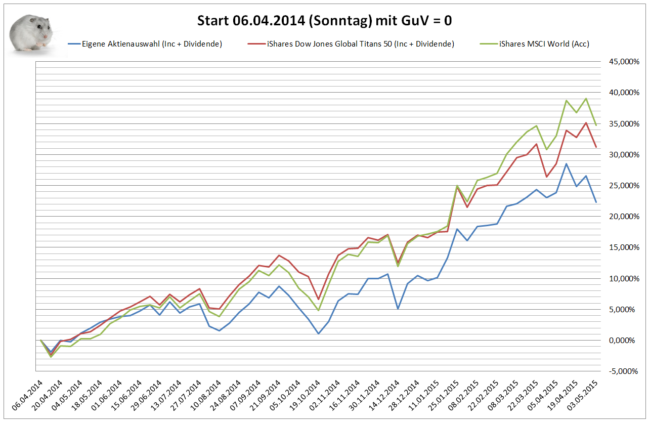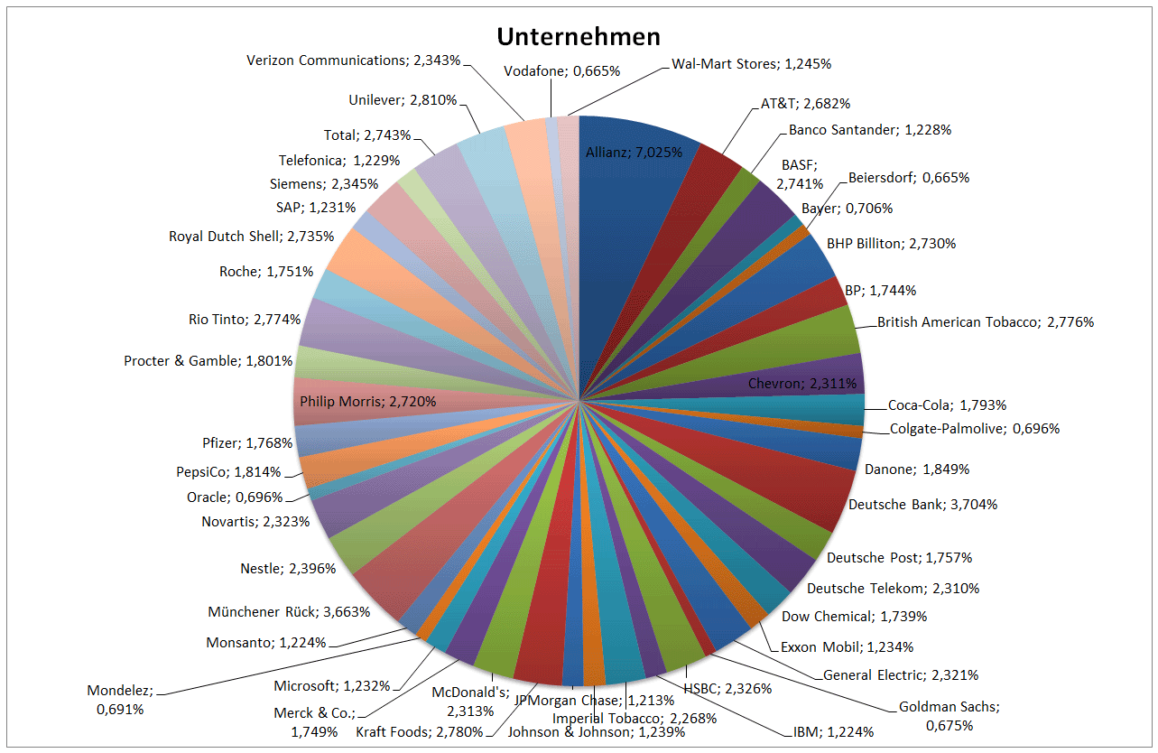 Hamsterrad Mai 1, 2015 Monatlicher Bericht (2015-04) Dividenden seit dem letzten Bericht: Zukäufe seit dem letzten Bericht: Microsoft (teilweise Umschichtung) Wal-Mart Stores (teilweise Umschichtung) Siemens (Umschichtung) AT&T (Umschichtung) Blackrock (Umschichtung) IBM (Umschichtung) Johnson & Johnson (Umschichtung) Procter & Gamble (Umschichtung) Coca-Cola (Umschichtung) Monsanto (Umschichtung) Verkäufe seit dem letzten Bericht: HSBC (Umschichtung) BP (Umschichtung) Dow Chemical (Umschichtung) BHP Billiton (Umschichtung) Rio Tinto (Umschichtung) Total (Umschichtung) Royal Dutch Shell (Umschichtung) Aktuelle Gewichtung und Zukäufe Unternehmen: Aktuelle Gewichtung Branchen / Sektoren / Länder / Währungen: Aktuelle Gewichtung je Branche: Übersicht mit Kennzahlen: Performance seit Auflegung inkl. Vergleichsindexes: Aktuelle GuV Unternehmen + Vergleichsindexes: Diesen Beitrag teilen Link zum Beitrag