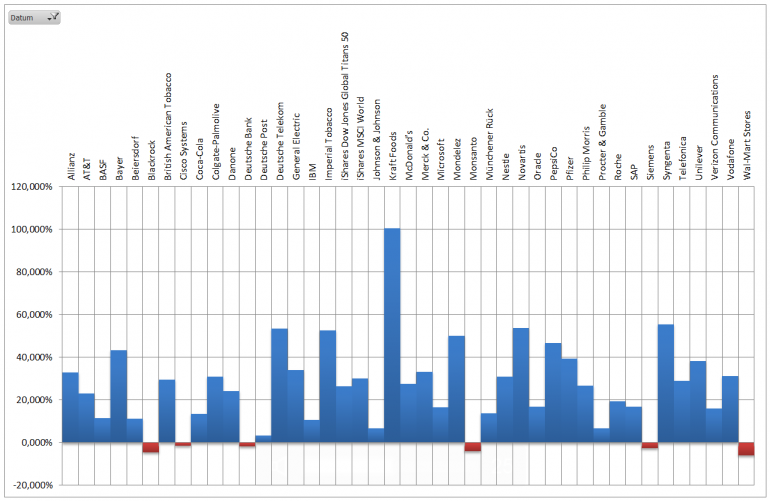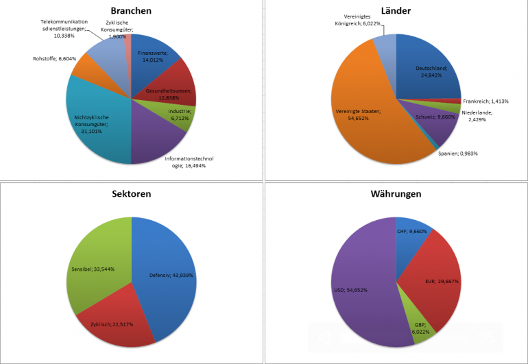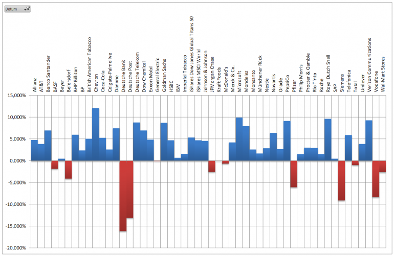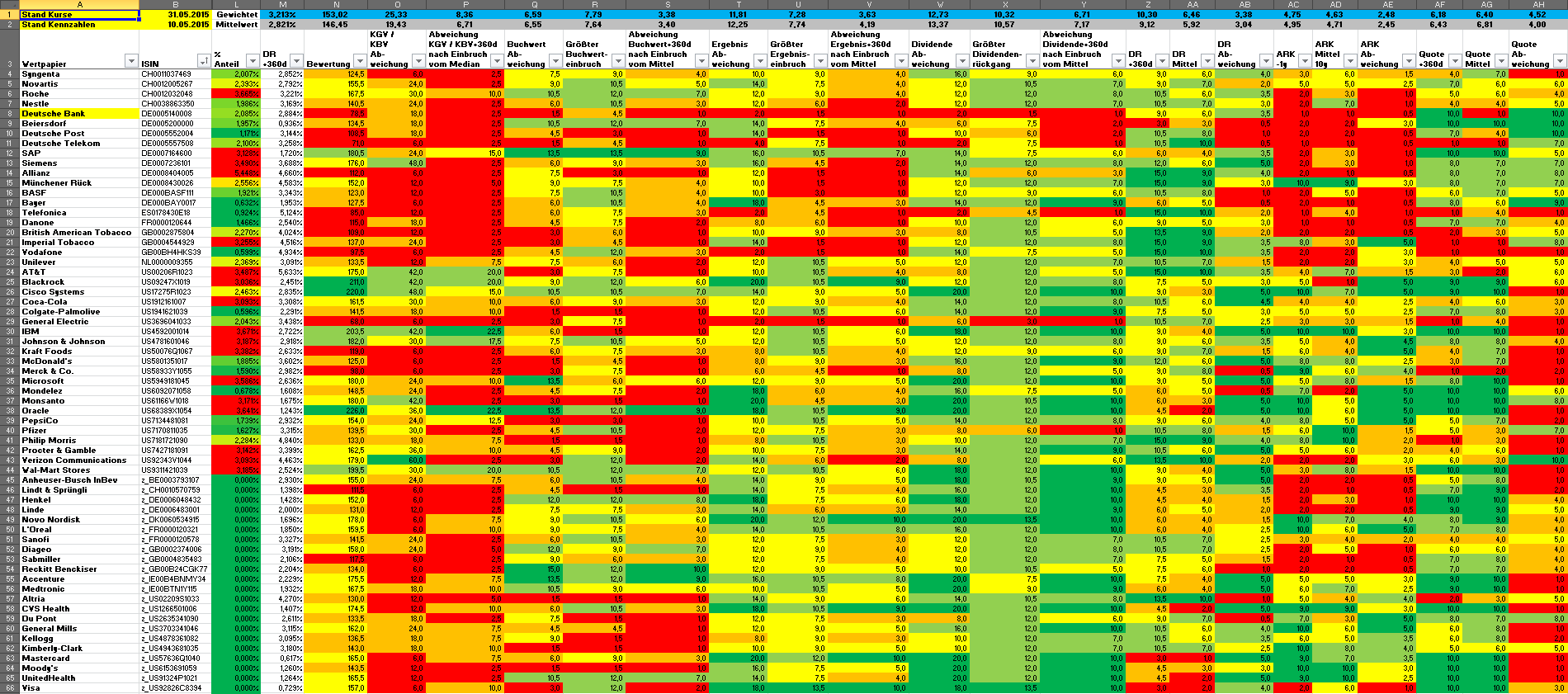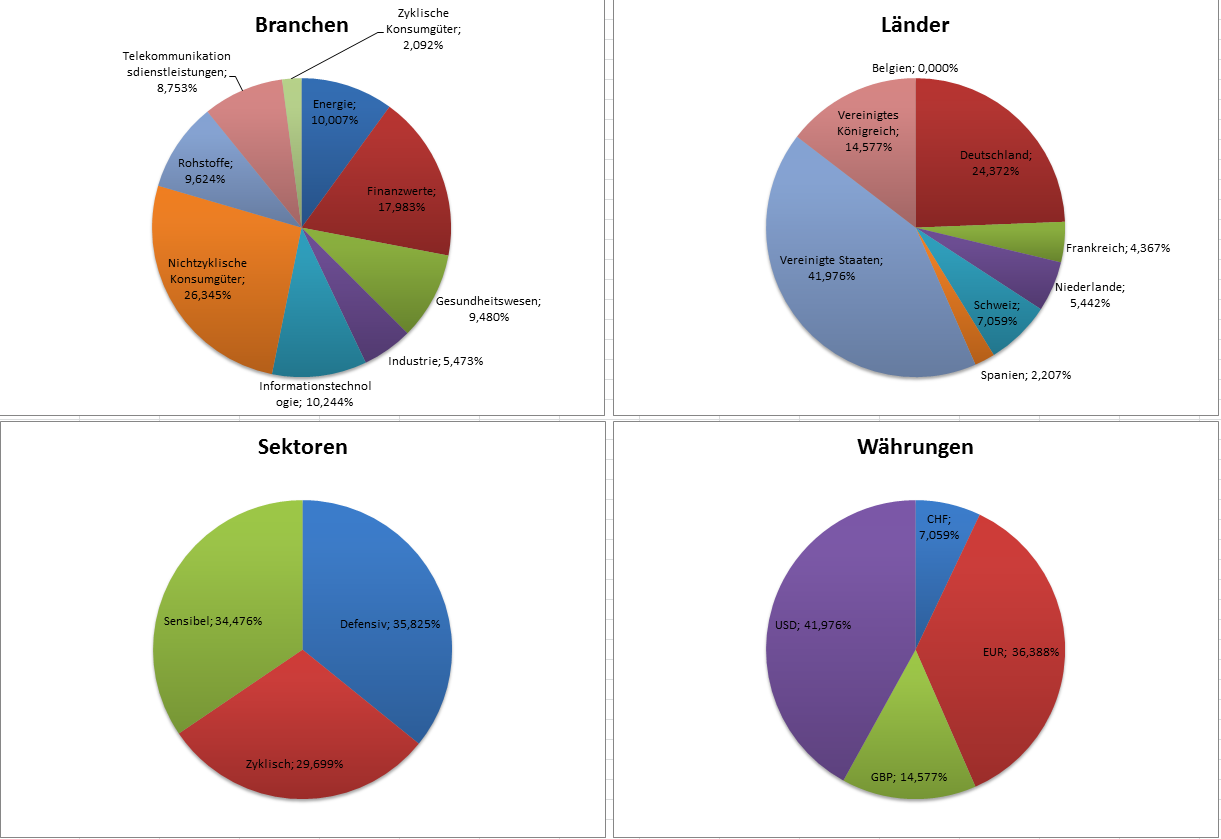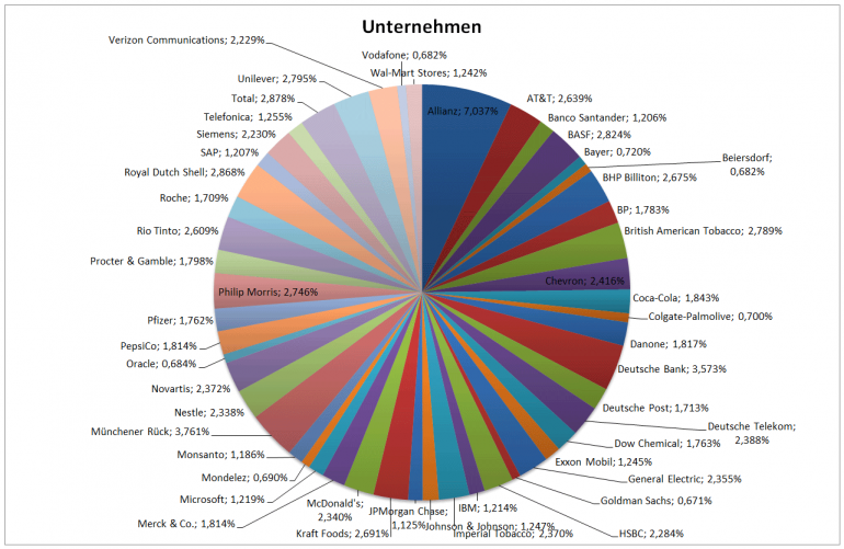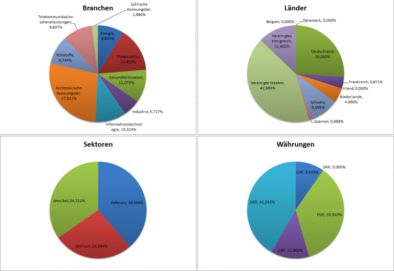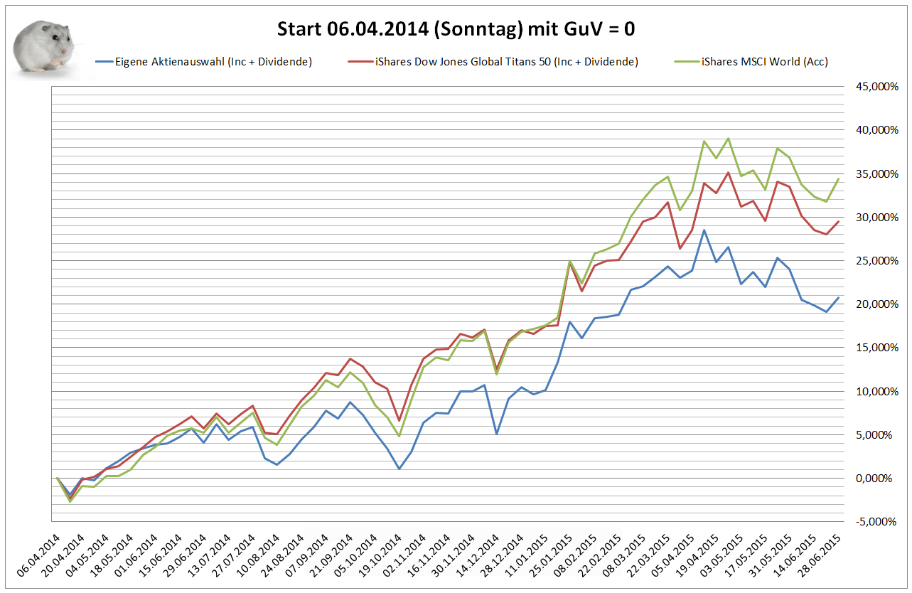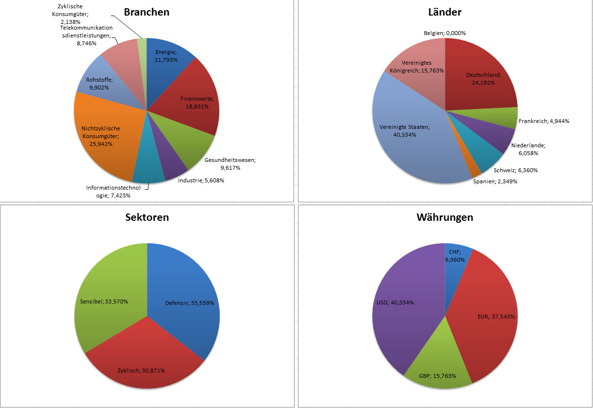 Hamsterrad Mai 1, 2015 Monatlicher Bericht (2015-04) Dividenden seit dem letzten Bericht: Zukäufe seit dem letzten Bericht: Microsoft (teilweise Umschichtung) Wal-Mart Stores (teilweise Umschichtung) Siemens (Umschichtung) AT&T (Umschichtung) Blackrock (Umschichtung) IBM (Umschichtung) Johnson & Johnson (Umschichtung) Procter & Gamble (Umschichtung) Coca-Cola (Umschichtung) Monsanto (Umschichtung) Verkäufe seit dem letzten Bericht: HSBC (Umschichtung) BP (Umschichtung) Dow Chemical (Umschichtung) BHP Billiton (Umschichtung) Rio Tinto (Umschichtung) Total (Umschichtung) Royal Dutch Shell (Umschichtung) Aktuelle Gewichtung und Zukäufe Unternehmen: Aktuelle Gewichtung Branchen / Sektoren / Länder / Währungen: Aktuelle Gewichtung je Branche: Übersicht mit Kennzahlen: Performance seit Auflegung inkl. Vergleichsindexes: Aktuelle GuV Unternehmen + Vergleichsindexes: Diesen Beitrag teilen Link zum Beitrag