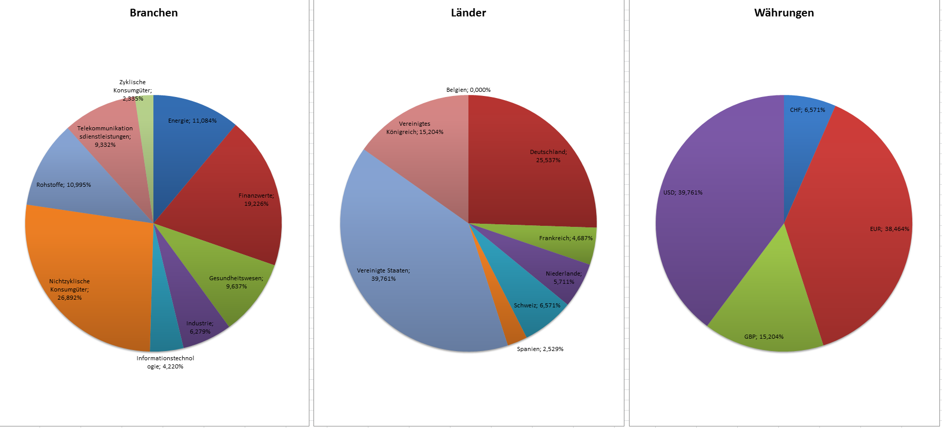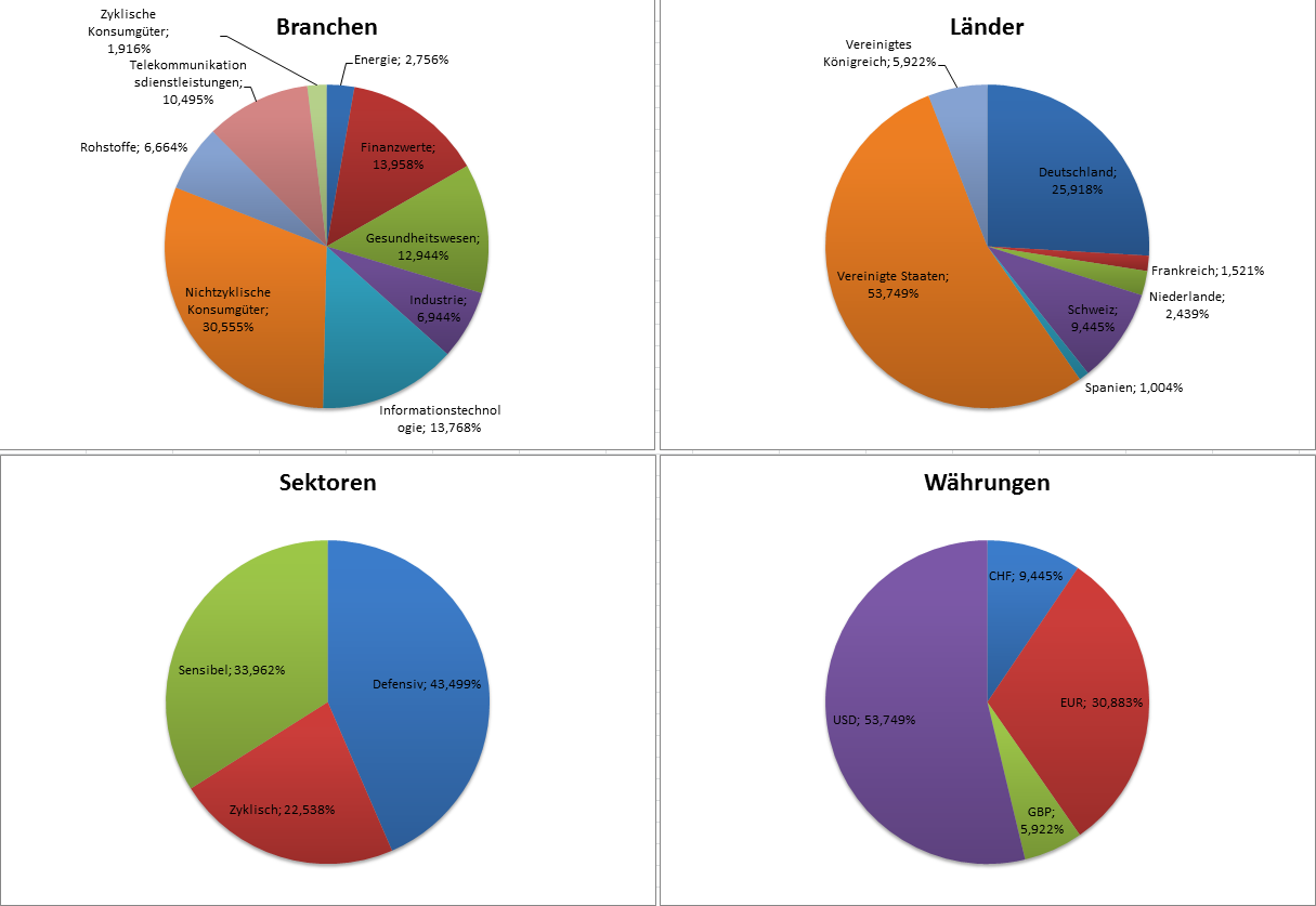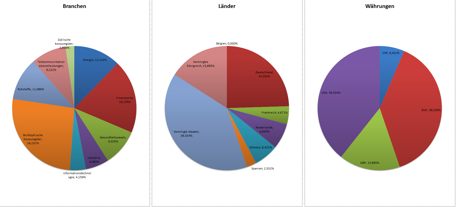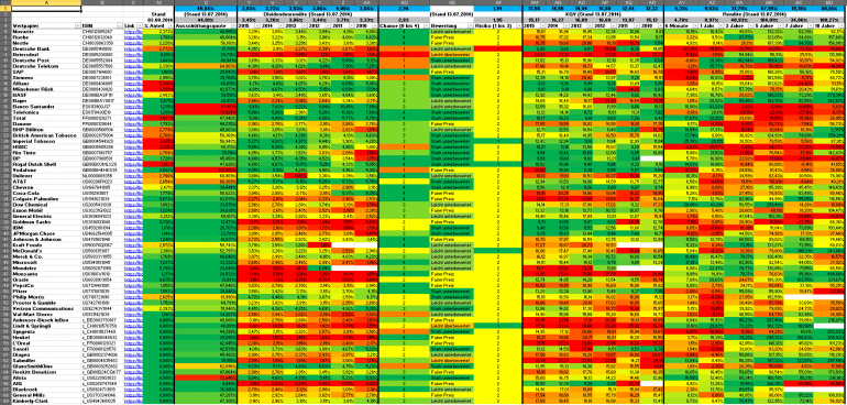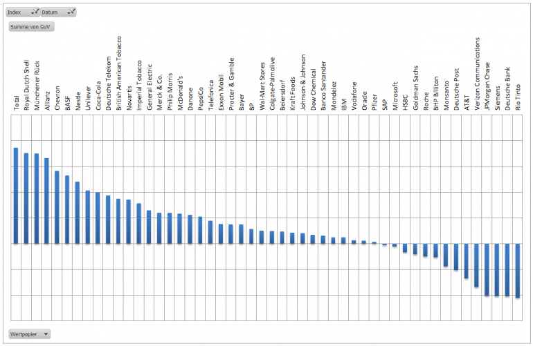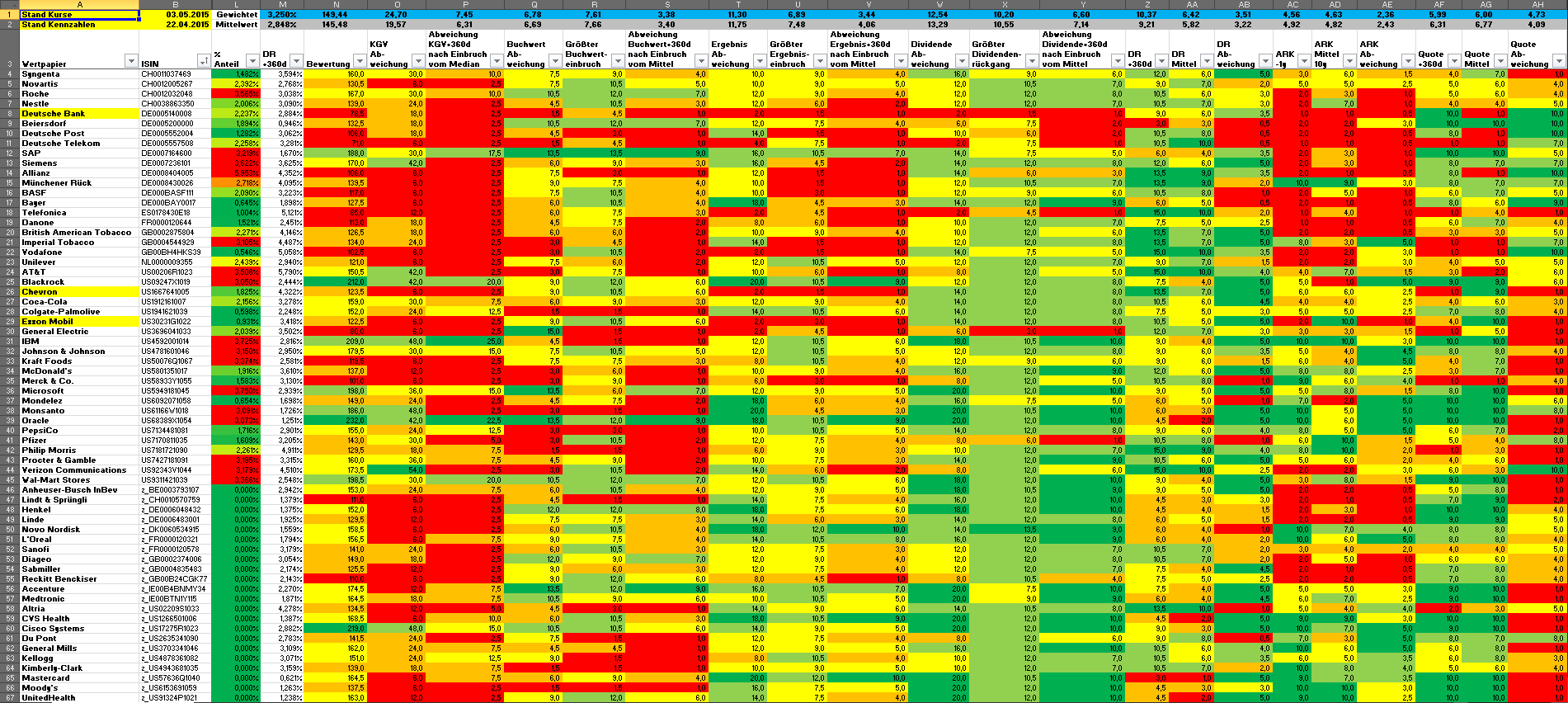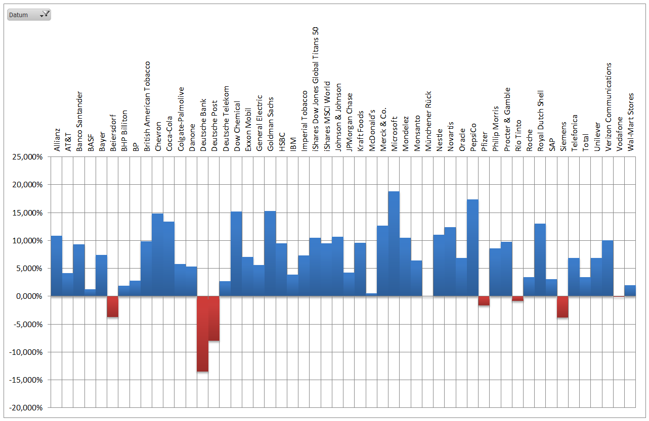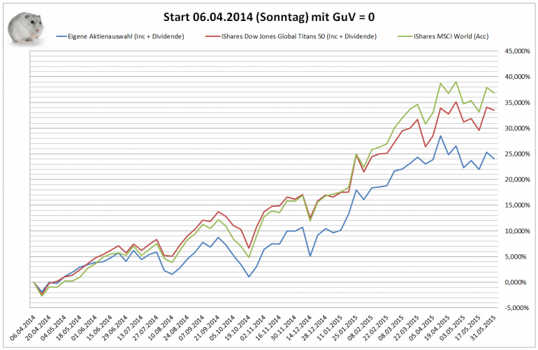 Hamsterrad Mai 1, 2015 Monatlicher Bericht (2015-04) Dividenden seit dem letzten Bericht: Zukäufe seit dem letzten Bericht: Microsoft (teilweise Umschichtung) Wal-Mart Stores (teilweise Umschichtung) Siemens (Umschichtung) AT&T (Umschichtung) Blackrock (Umschichtung) IBM (Umschichtung) Johnson & Johnson (Umschichtung) Procter & Gamble (Umschichtung) Coca-Cola (Umschichtung) Monsanto (Umschichtung) Verkäufe seit dem letzten Bericht: HSBC (Umschichtung) BP (Umschichtung) Dow Chemical (Umschichtung) BHP Billiton (Umschichtung) Rio Tinto (Umschichtung) Total (Umschichtung) Royal Dutch Shell (Umschichtung) Aktuelle Gewichtung und Zukäufe Unternehmen: Aktuelle Gewichtung Branchen / Sektoren / Länder / Währungen: Aktuelle Gewichtung je Branche: Übersicht mit Kennzahlen: Performance seit Auflegung inkl. Vergleichsindexes: Aktuelle GuV Unternehmen + Vergleichsindexes: Diesen Beitrag teilen Link zum Beitrag
